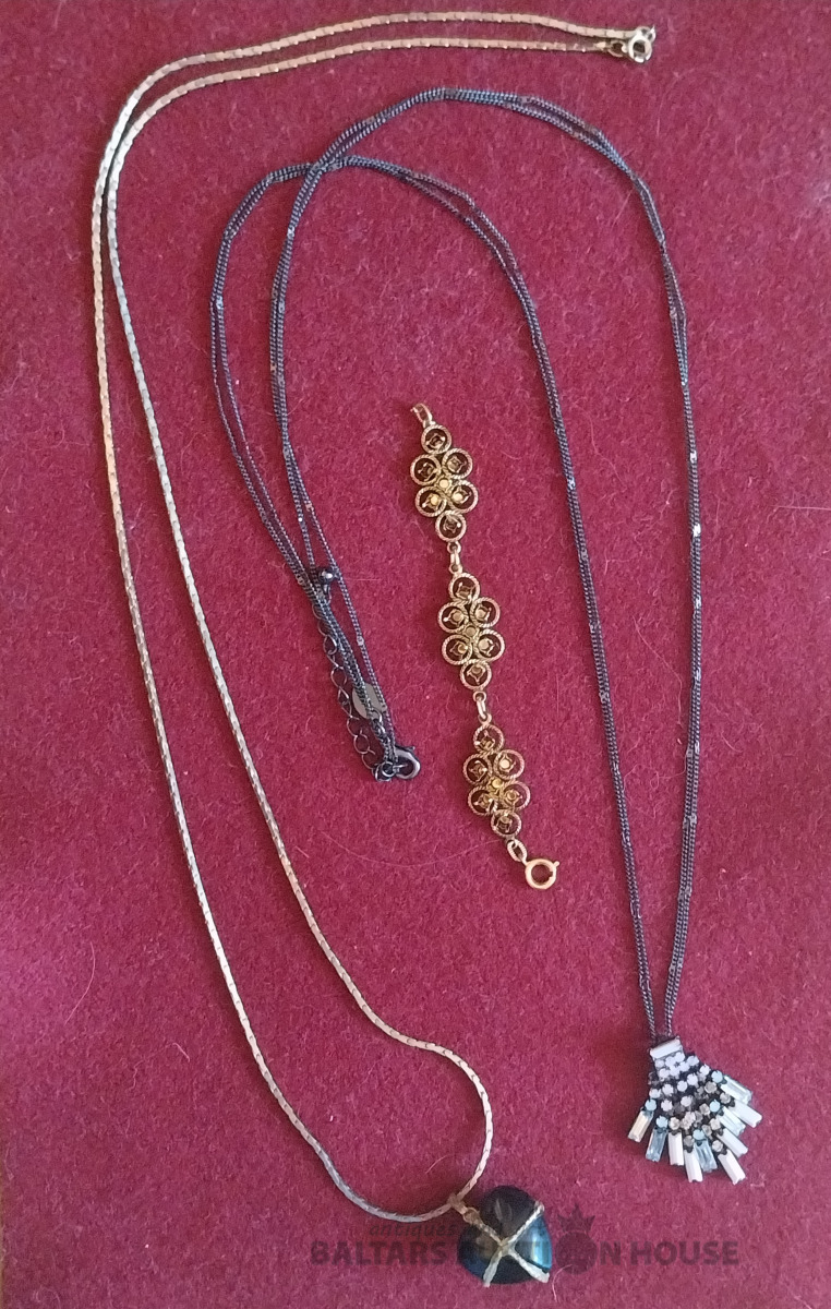 Bižutērija. 2 kaklarotas ArtDeco stilā un senlaicīga rotu detaļa.