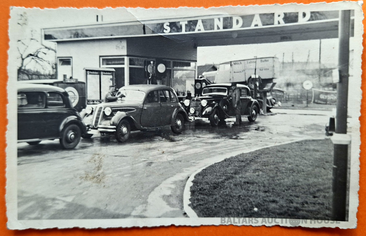 Vēsturisks brīdis iemūžināts vecā degvielas uzpildes stacijā: Attēlā redzama Standard degvielas uzpildes stacija, kas bija populāra 20. gs. 30. gados. Ainas centrālais elements ir tā laika automašīnu kolekcija, kas atgādina Ford Anglia un citas Eiropas automašīnas 20. gs. 30. gadu beigās.