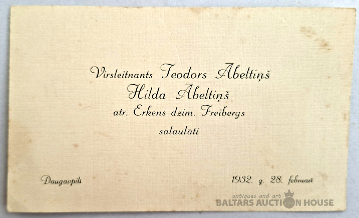 Kāzu ielūgums no Latvijas, 20. gs. trīsdesmito gadu sākums. Saturs: Kartīte vēsta par leitnanta Teodora Abeltiņa un Hildas Abeltiņas (dzimusi Freiberga) laulībām. Datums un vieta: Pasākums notika Daugavpilī 1932. gada 28. februārī. Konteksts: Šādi dokumenti kolekcionāriem ir vēsturiski interesanti.