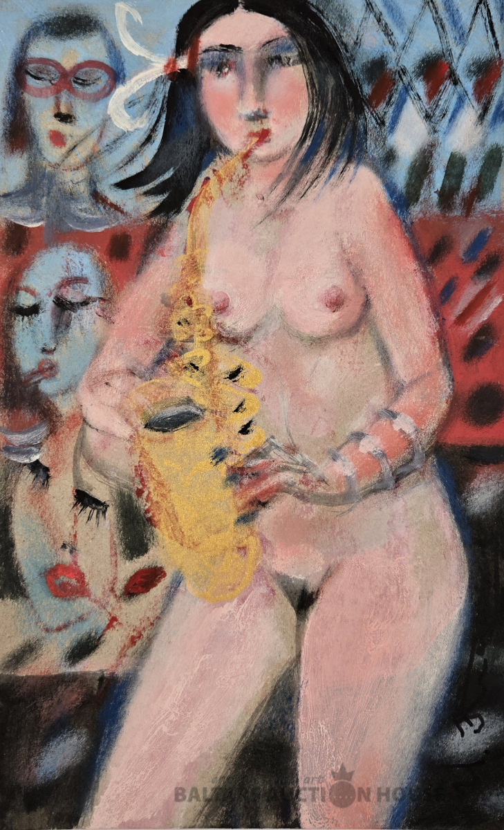 Uldis Krauze (1958). KAILA SIEVIETE AR SAKSAFONU. Kartons, jaukta tehnika. 325x20 cm