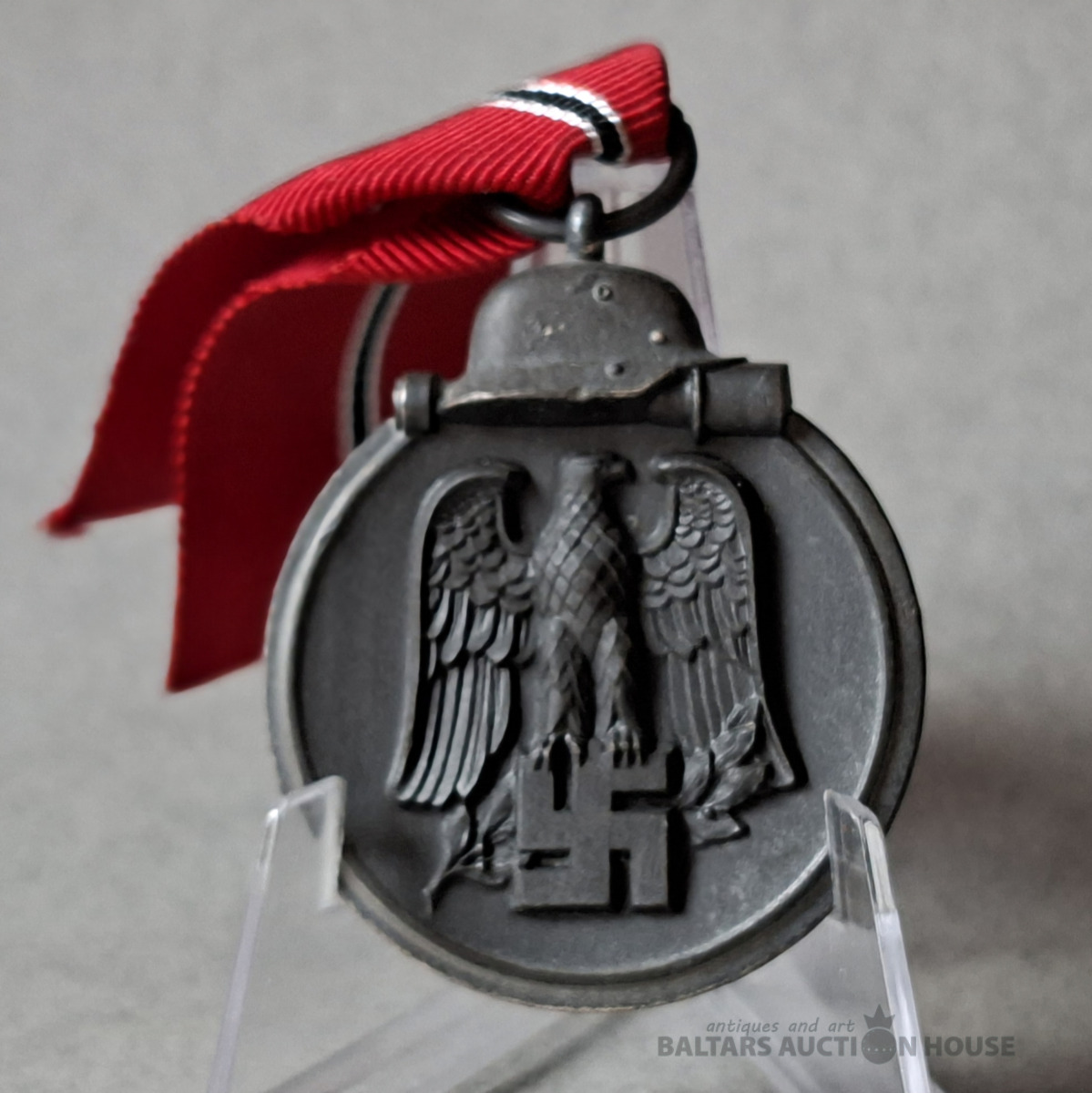 Vācijas militārais apbalvojums no Otrā pasaules kara — Medaille Winterschlacht im Osten 1941/42. Nosaukums: Oficiālais nosaukums: Medaļa par ziemas kampaņu Austrumos 1941/42., Pazīstamības zīme "4" - Steinhauer & Lück, Lüdenscheid (Steinhauer un Lück, Lüdenscheid pilsēta; Ziemeļreina-Vestfālene; 4 - reģistrācijas numurs pēc LDO sistēmas; Leistungs Gemeinschaft der Deutscher Ordenshersteller - Vācijas apbalvojumu veidotāju asociācijas reģistrācijas numurs no 1945).