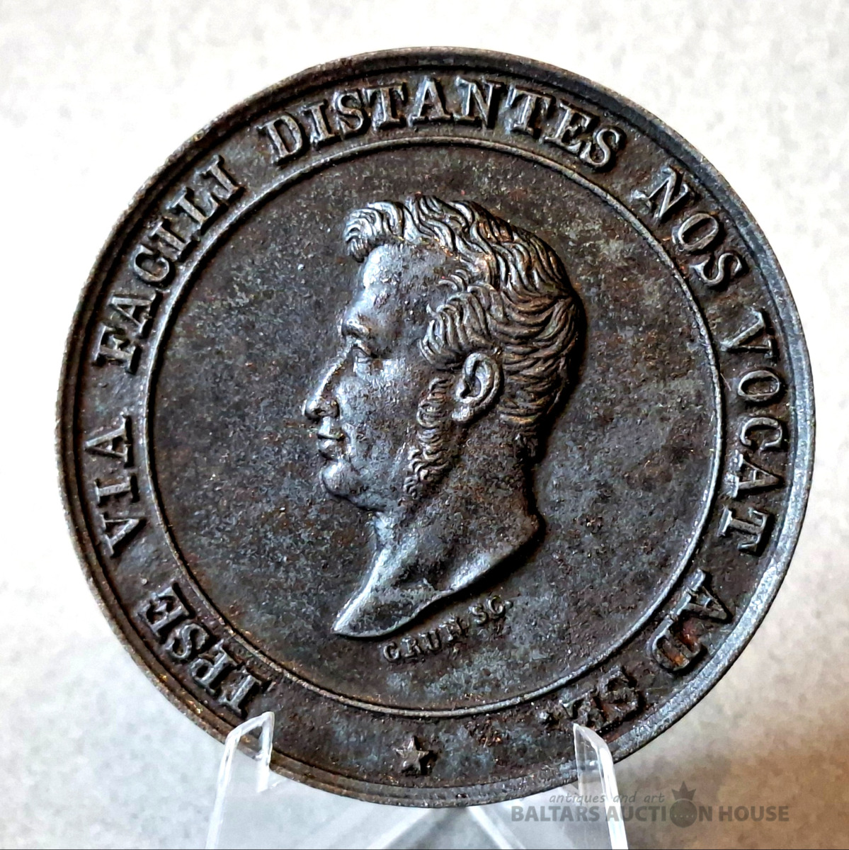 Reta medaļa par čuguna liešanu 1827. gadā (Grēns). Par Luksemburgas Viljama I dzelzceļa posma būvdarbiem. Virzieties pa kreisi. 8 vēstules rindiņas.