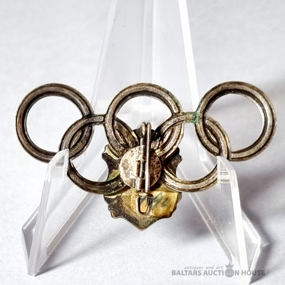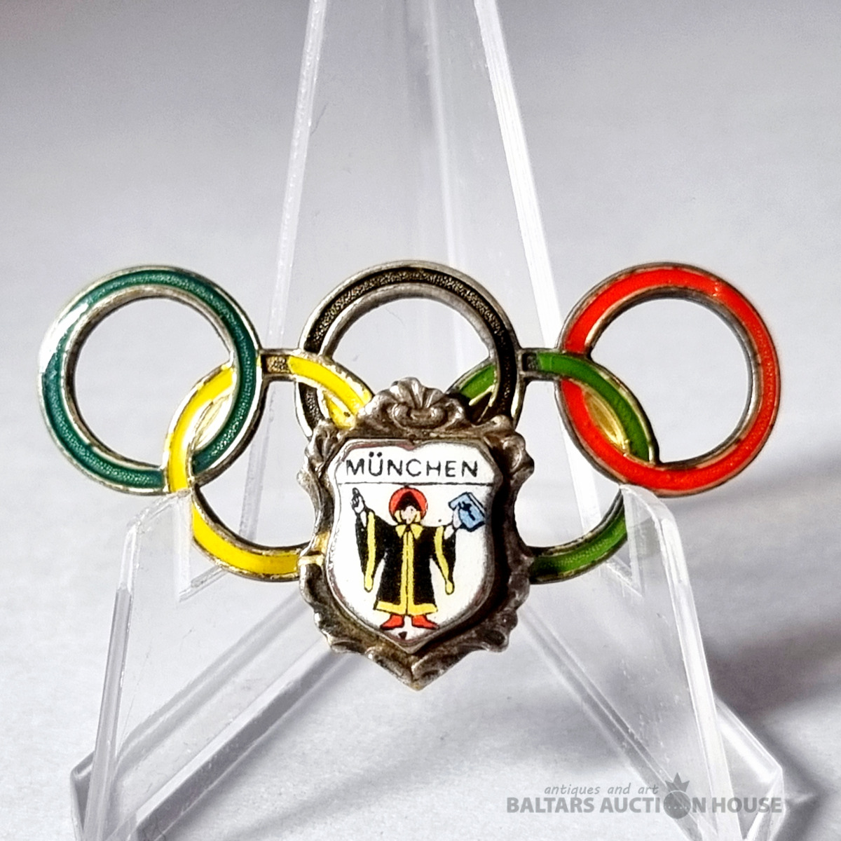 Antīka kolekcionējama piespraude no 1972. gada Minhenes vasaras olimpiskajām spēlēm, kas veidota olimpisko gredzenu formā ar Minhenes pilsētas ģerboni. Nosaukums: Minhenes 1972. gada olimpiskā piespraude.