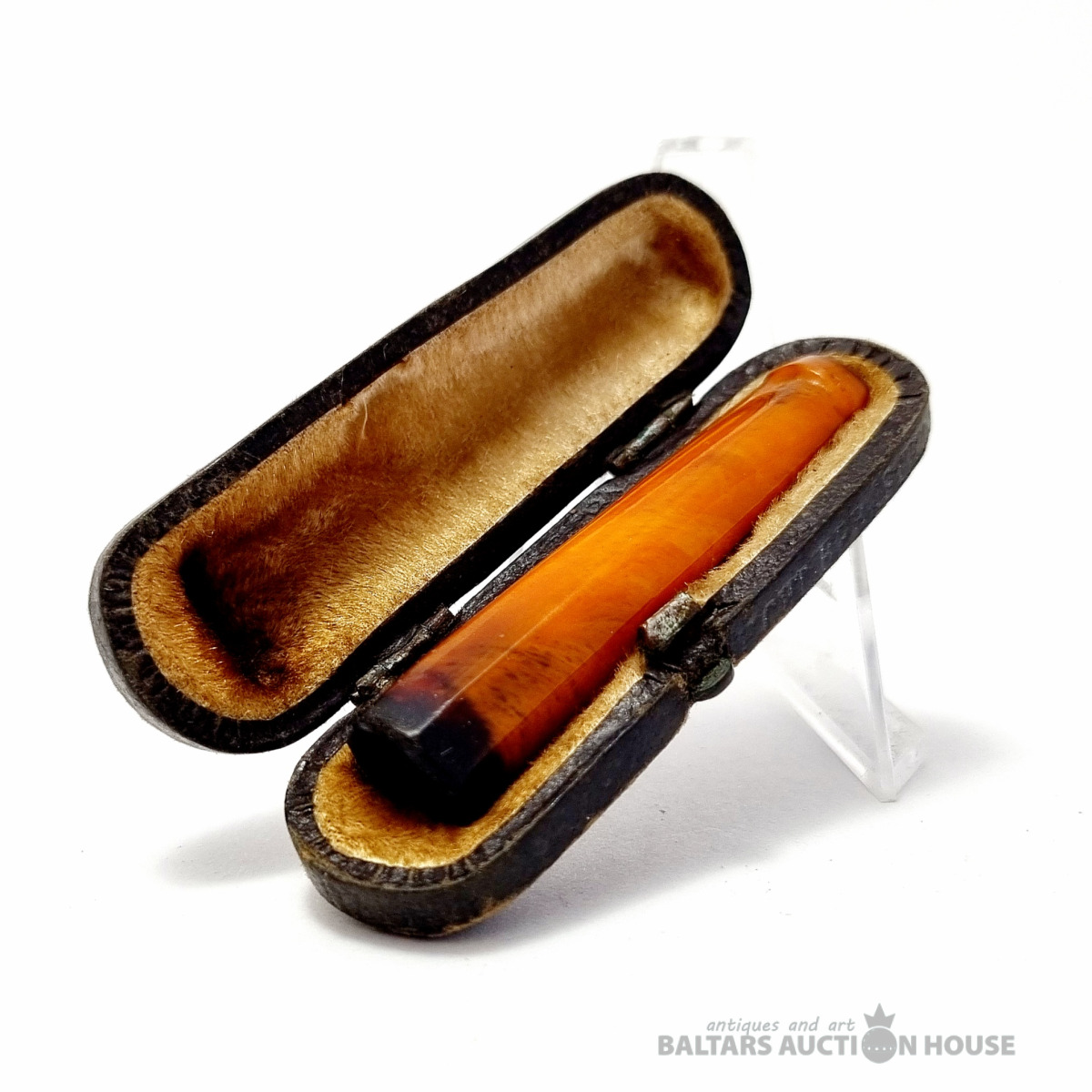 Mutes uzgalis futrālī. Kopējais svars 3,3 g. Izstrādājuma izmērs 5,3 cm. Presēts dzintars. Stāvoklis redzams fotoattēlā.