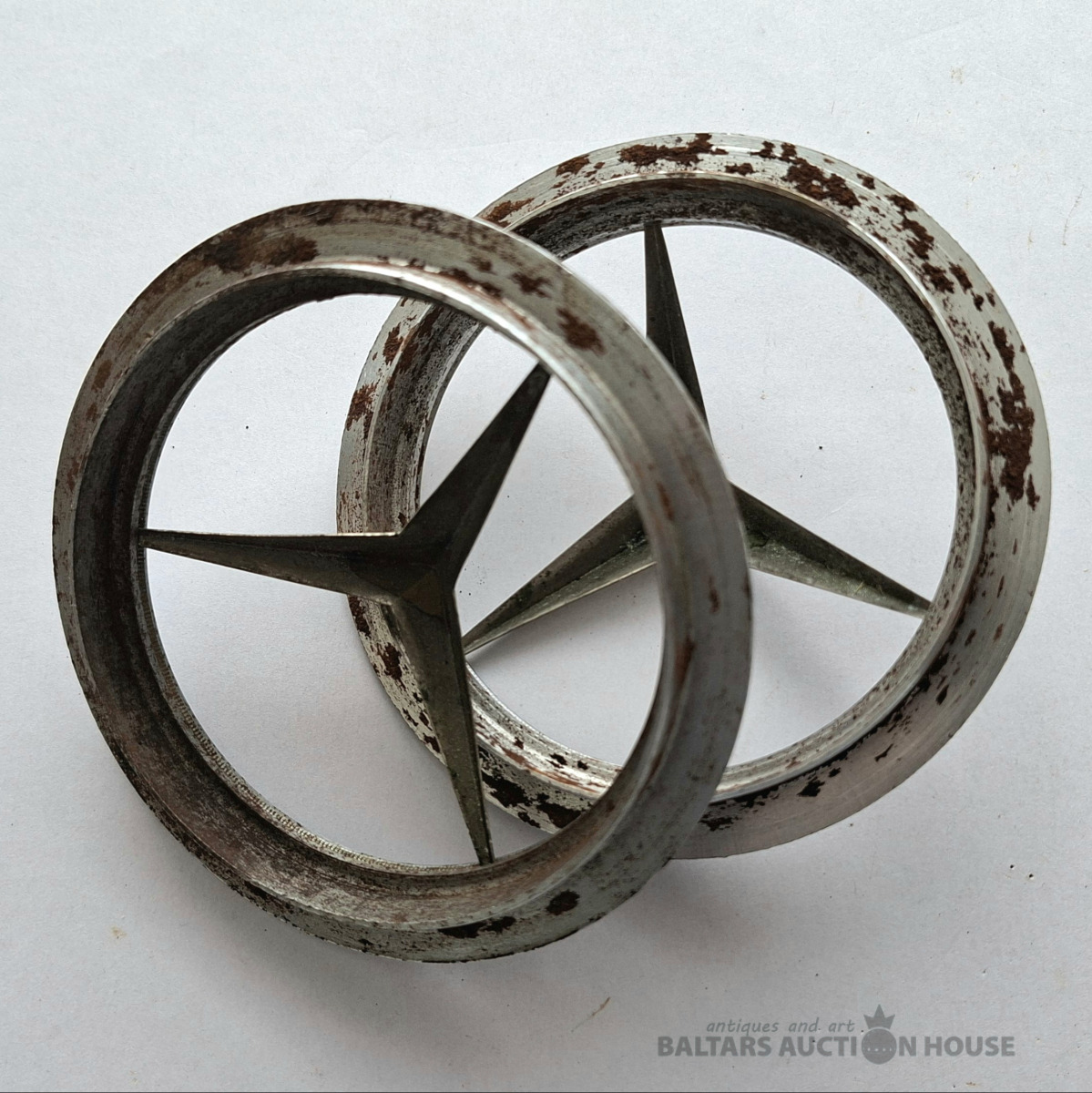 Antīkas Mercedes-Benz automašīnu emblēmas (riteņiem?), kas tiek uzskatītas par kolekcionējamiem priekšmetiem. Diametrs: 11 cm. Centrs: pārvietojams.