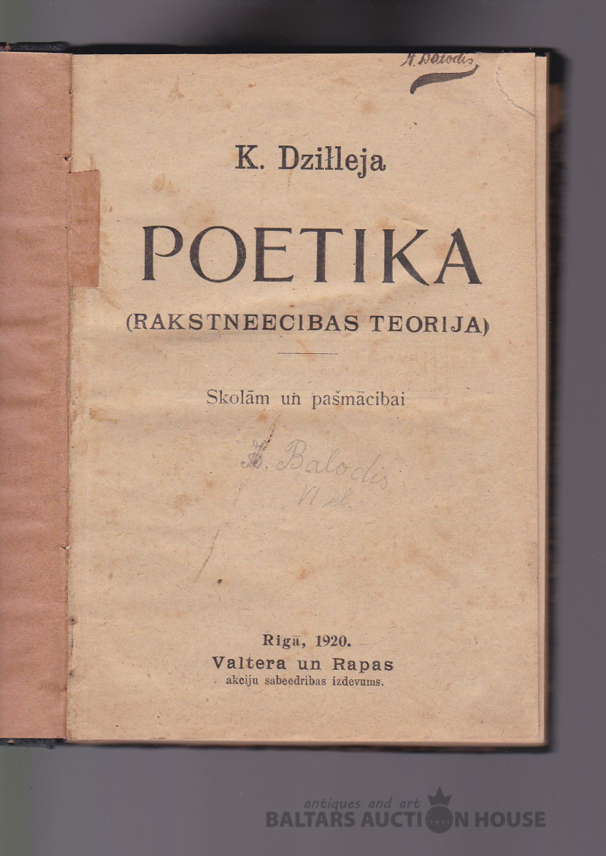 Kārlis Dziļleja POETIKA (rakstniecības teorija), 1920. g. Valters un Rapa. Labs izziņas un mācību avots