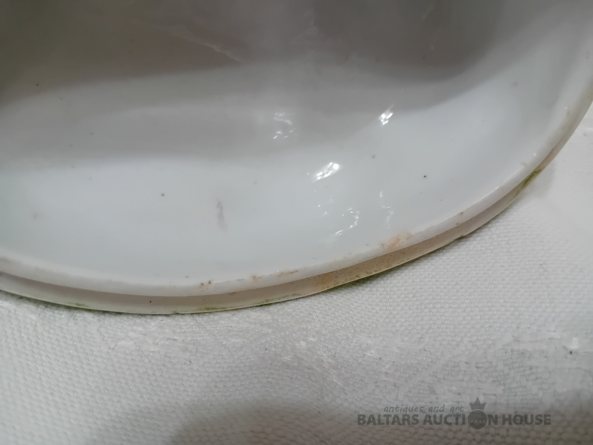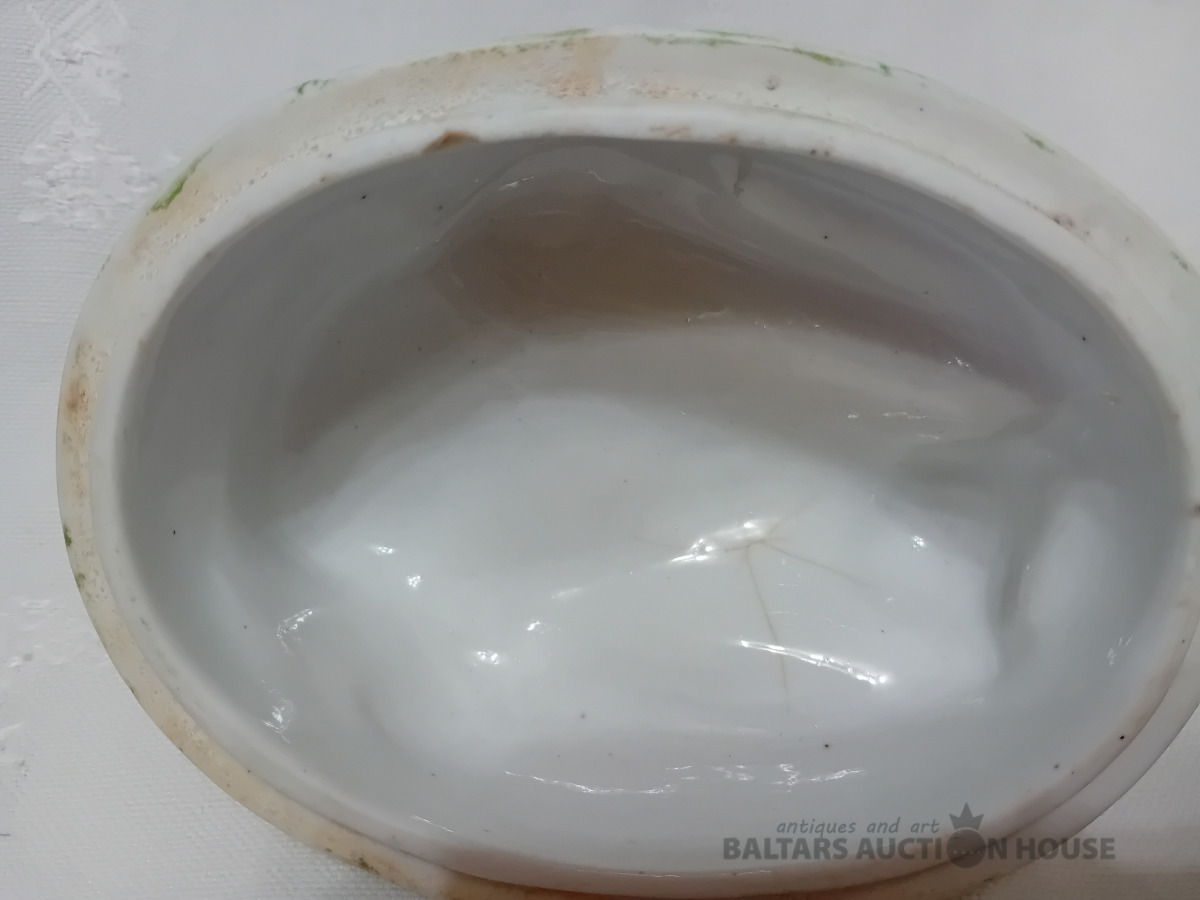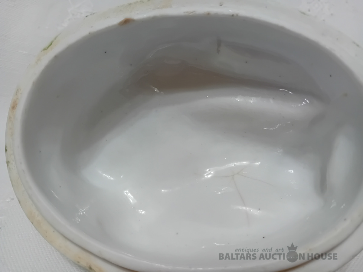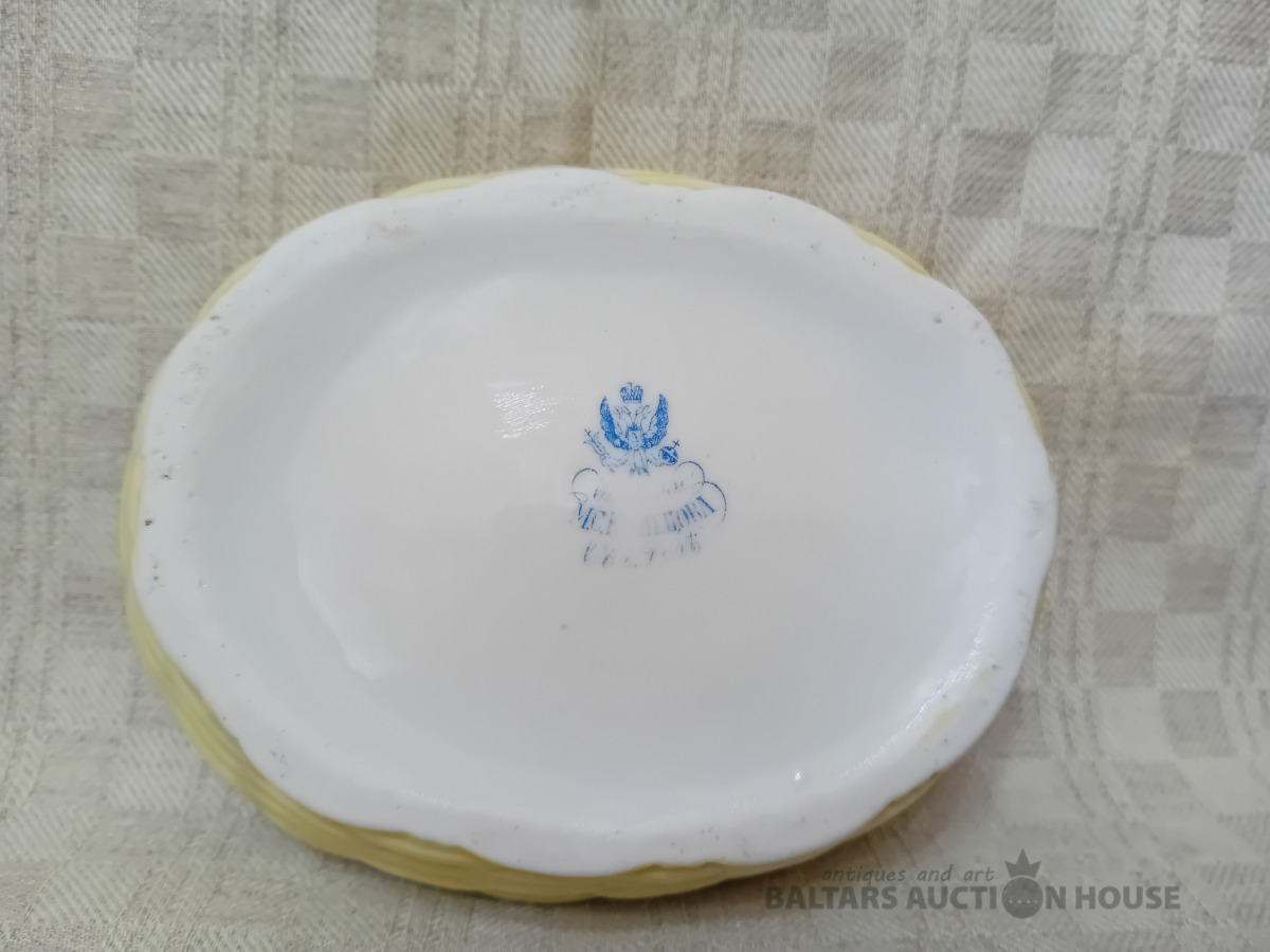Cara laika Kuzņeovs Rīgā, sviesta trauks, pocelāns,14.5*11.5 cm, 4.5 cm h-pamatne, ir defekti, Vākam iekšpusē zirnekļa veida plaisa, kas daļēji iznāk virspusē, robs,astei glazūras atsitums, pamatnē veca plaisa, kas turpinās, kā ""svaiga""