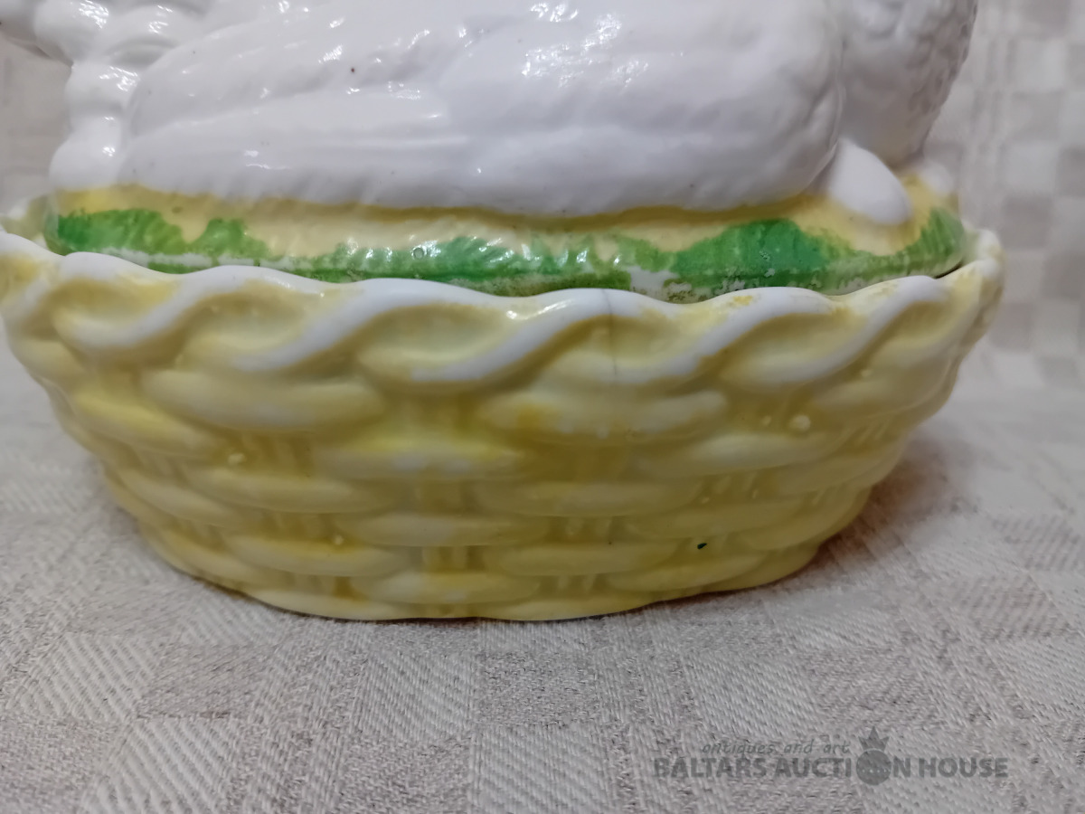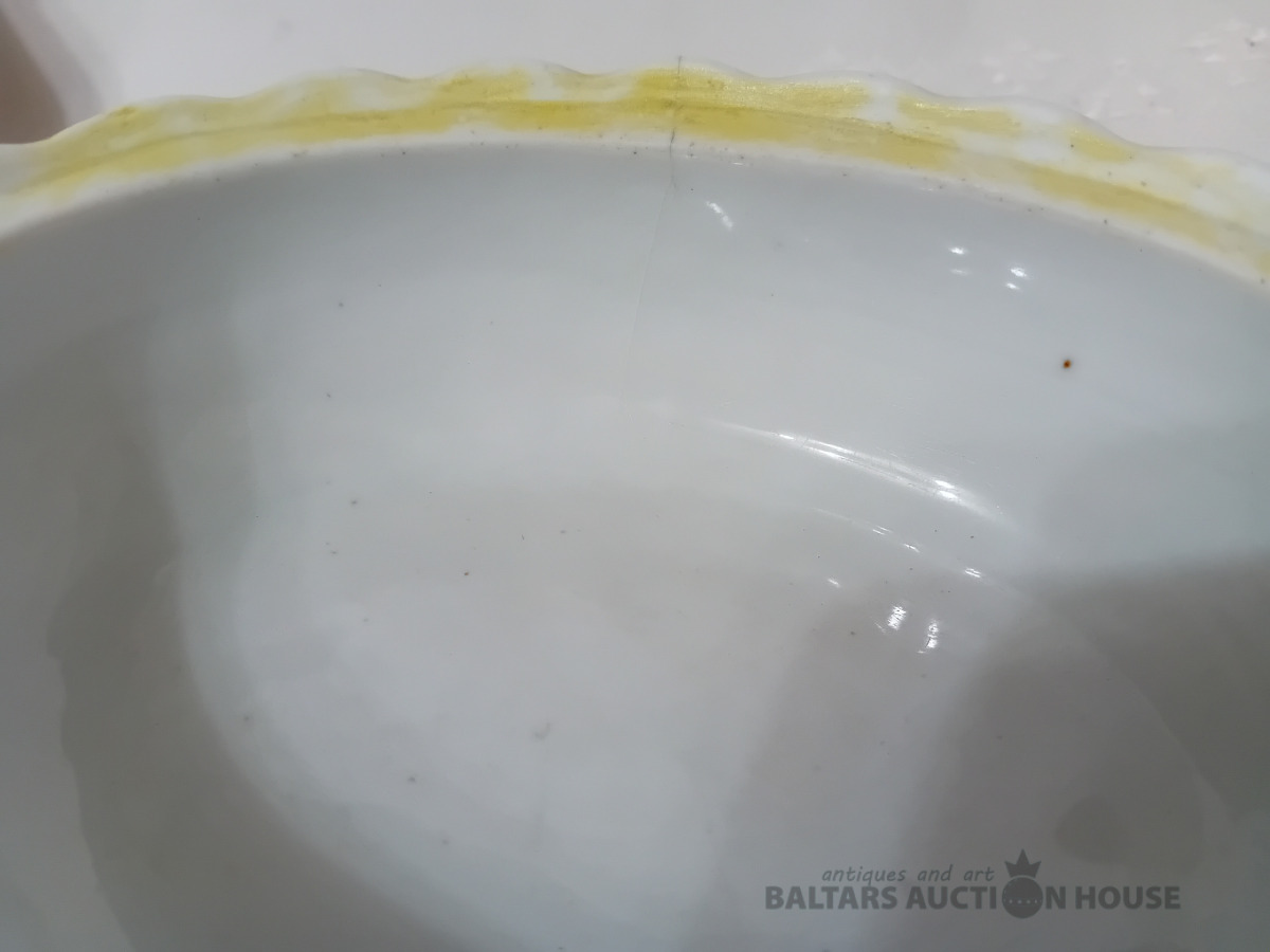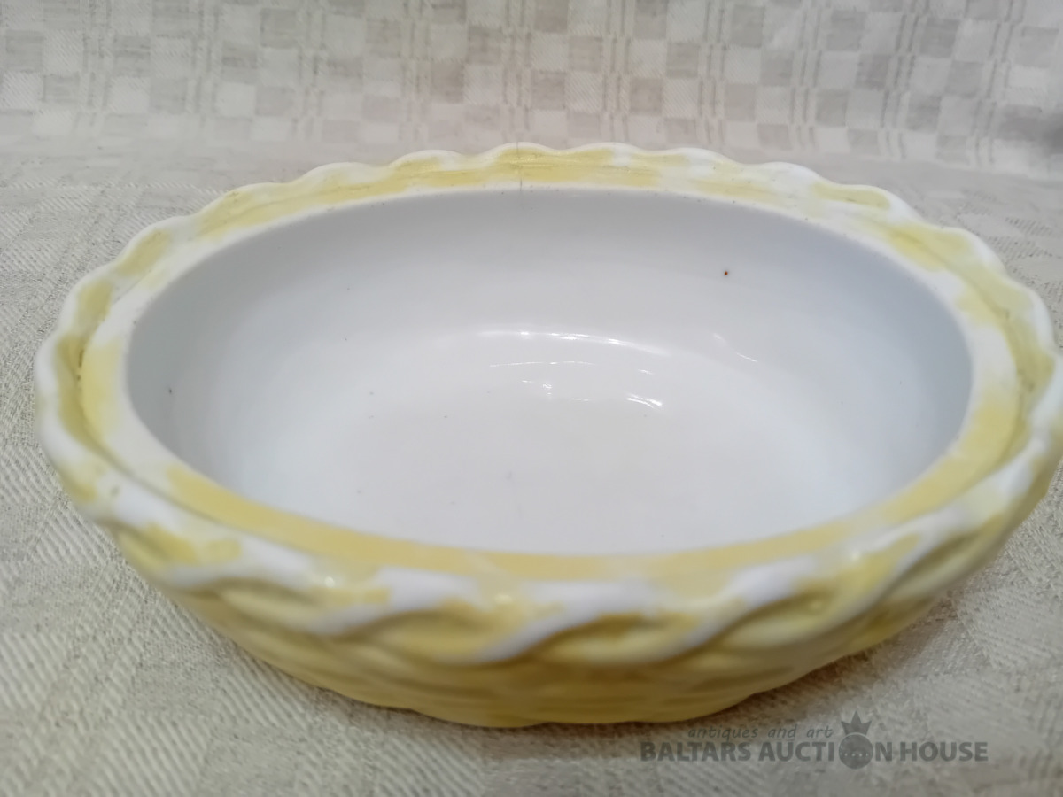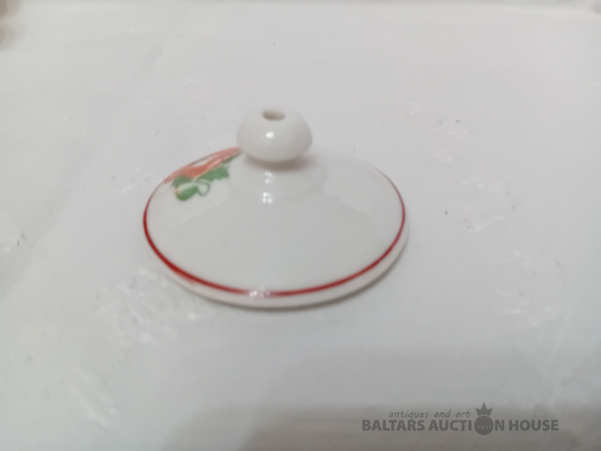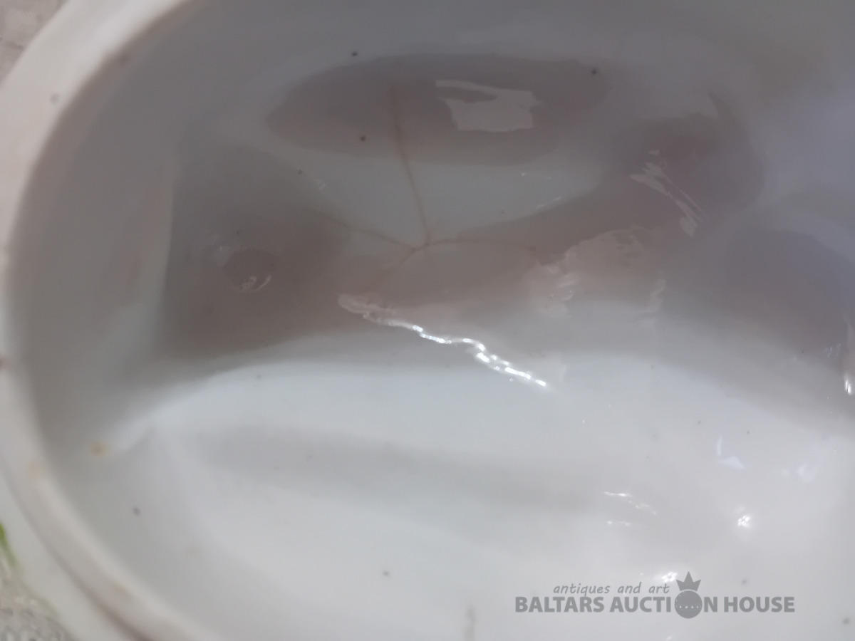 Cara laika Kuzņeovs Rīgā, sviesta trauks, pocelāns,14.5*11.5 cm, 4.5 cm h-pamatne, ir defekti, Vākam iekšpusē zirnekļa veida plaisa, kas daļēji iznāk virspusē, robs,astei glazūras atsitums, pamatnē veca plaisa, kas turpinās, kā ""svaiga""