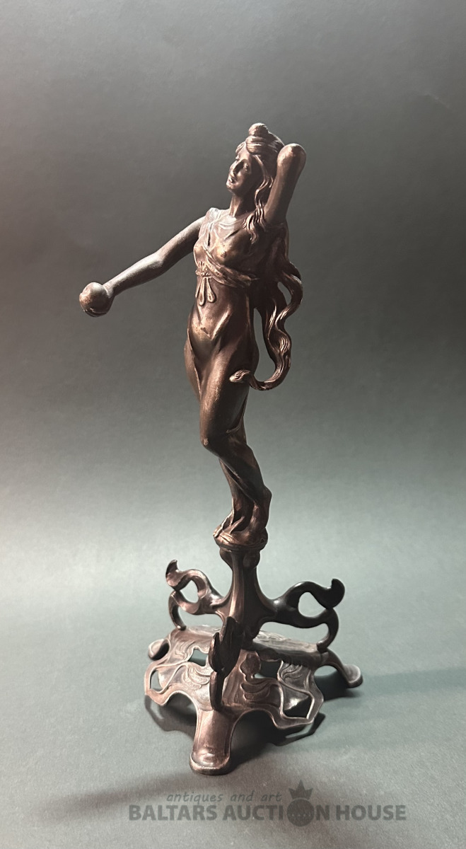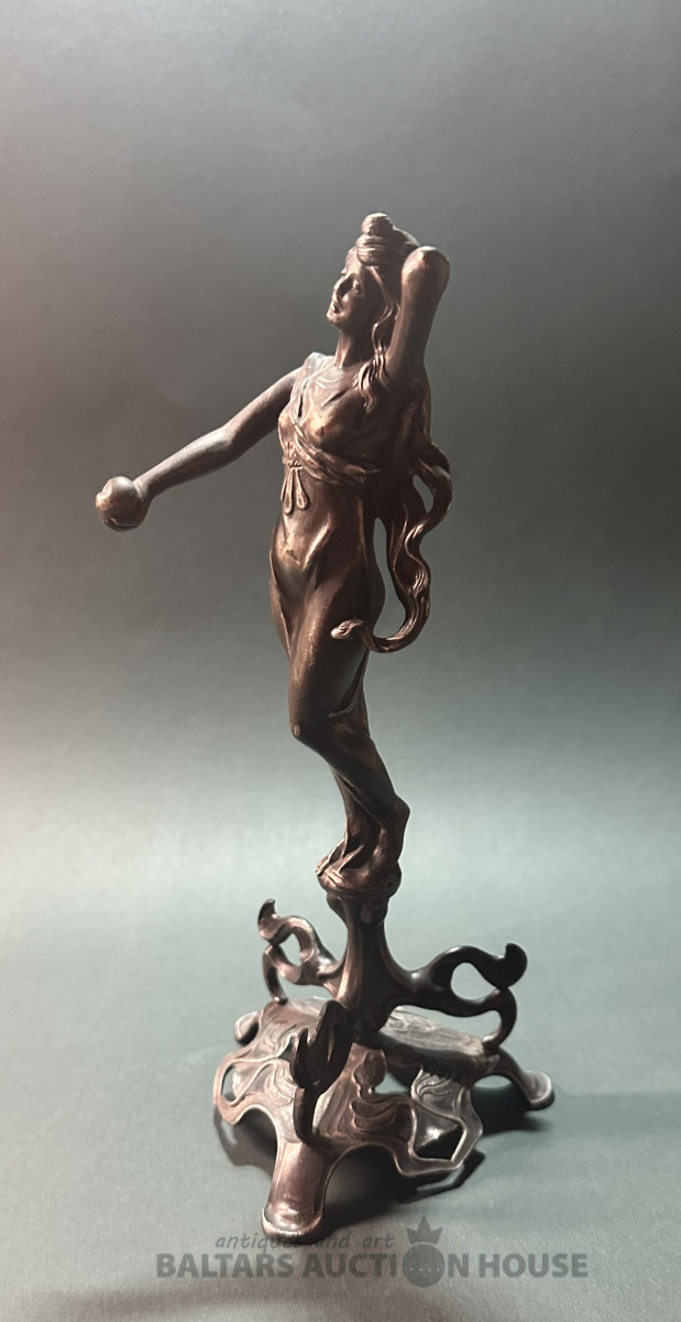 Jūgendstila statuete, 19/20. gds. mija?, augstums 23 cm, bez defektiem, metāls špialtrs.