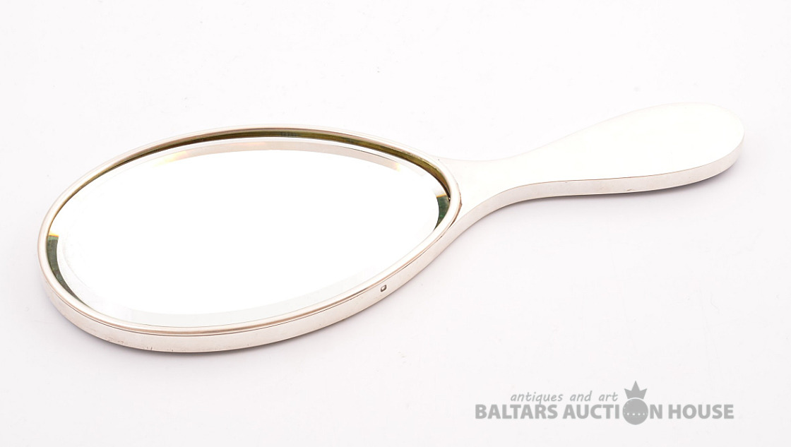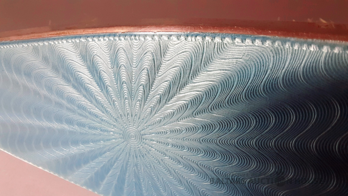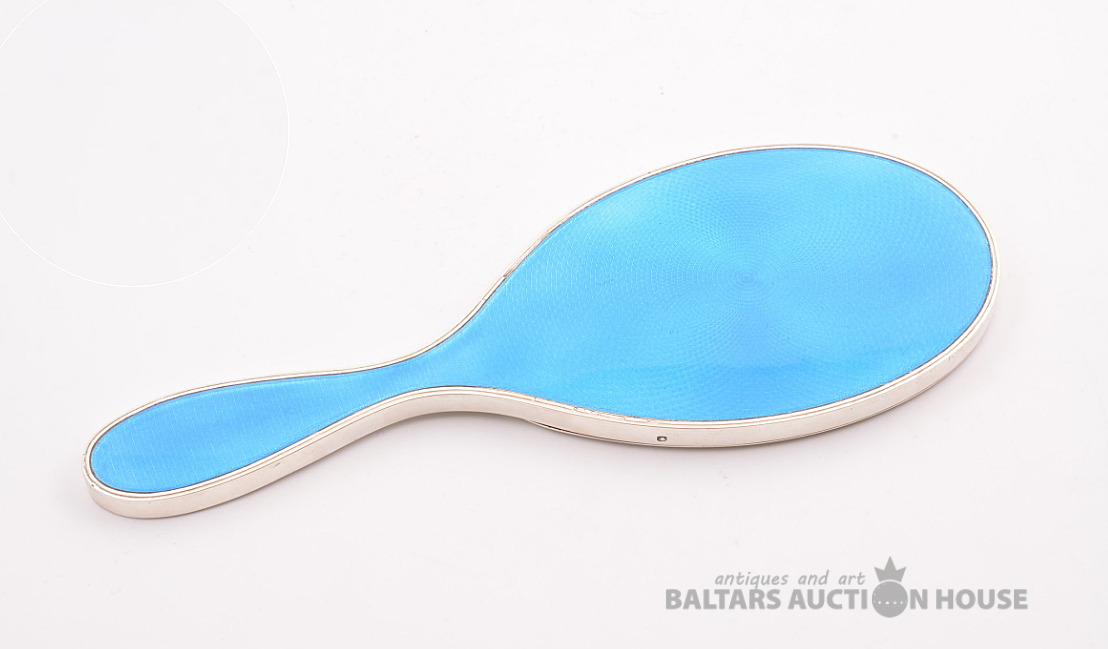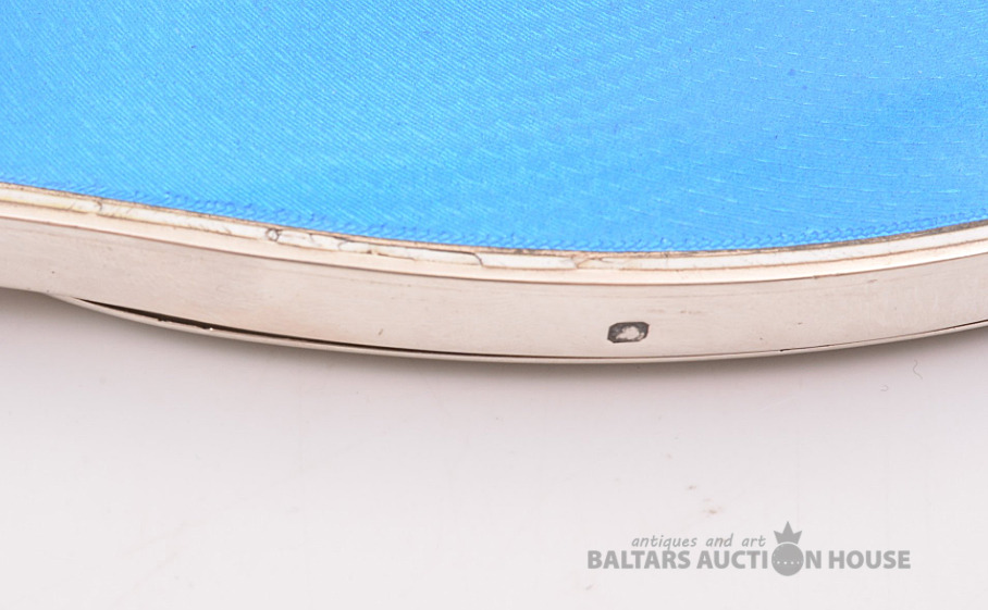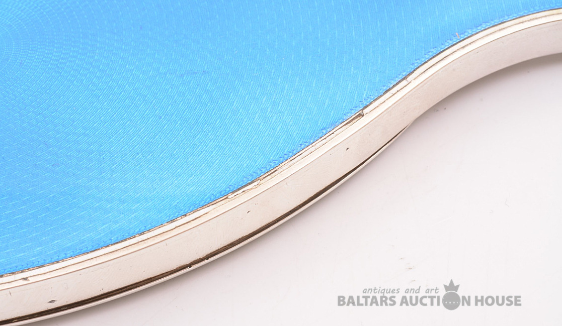 Rokas spogulis, sudrabs, spilgti zila giljošas emalja, 950 proves vērtība, izstrādājuma kopējais svars 367,95, emalja, 25,6 x 9,8 cm, 20. gadsimts, Francija.
