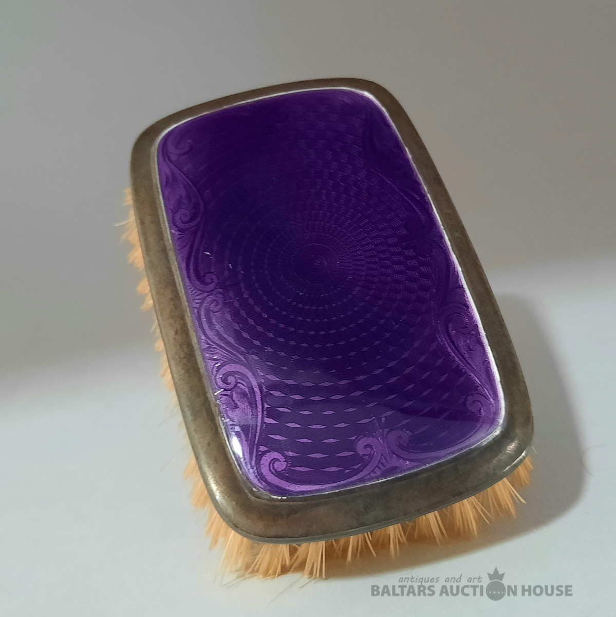 Giljošas otiņa (tumši violeta). Antīka angļu giljošas emaljas drēbju otiņa, piesātināti violeta. Sudrabs, giljoša, emalja, koks, dabīgi sari. 8 cm x 5,5 cm. Liejuma pazīmes. Skaists, krāsains priekšmets.
