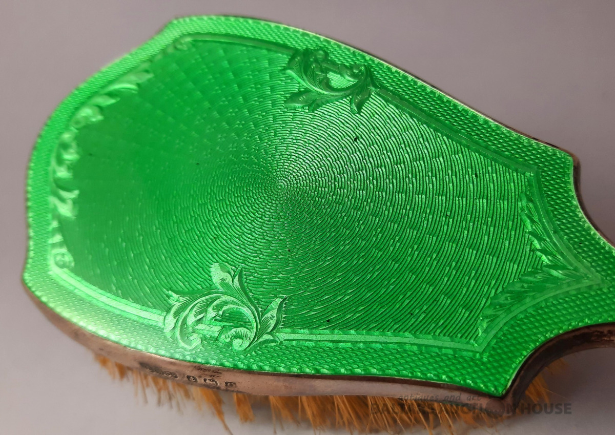 Antīka giloša otiņa. Zaļa. Antīka drēbju otiņa ar giloša emalju, Anglija, piesātināti zaļa. Sudrabs, giloša, emalja, koks, dabīgi sari. 23,5 cm. Krāsains priekšmets.