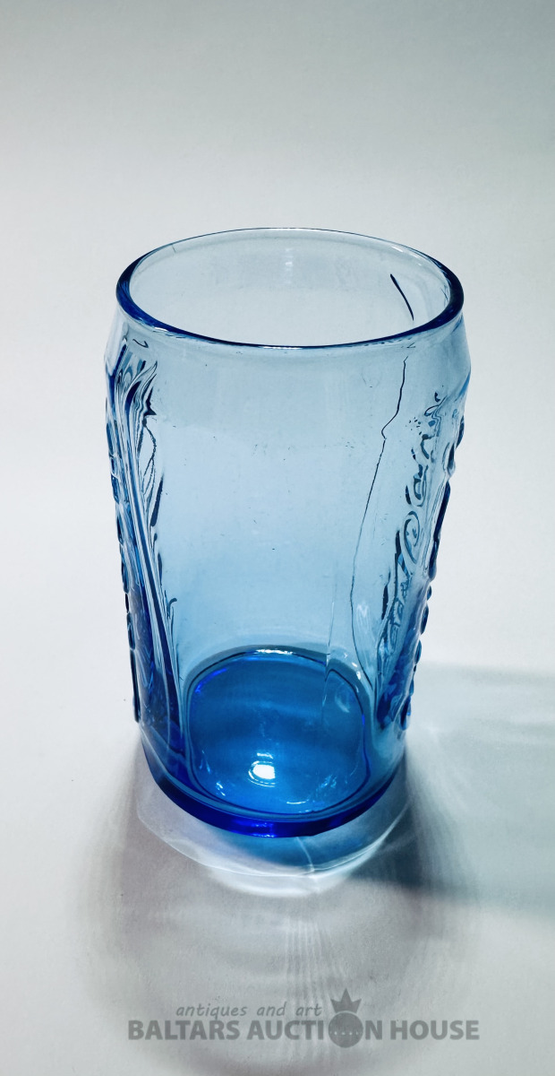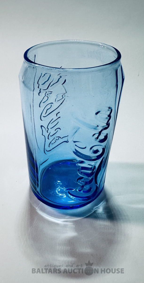 Zila stikla dizaina glāze, zīmols Coca-Cola, metāla bundžas forma, tilpums 330 ml, lāzergravēts reģistrācijas kārtas numurs, no kolekcijas, jaunvērtība.