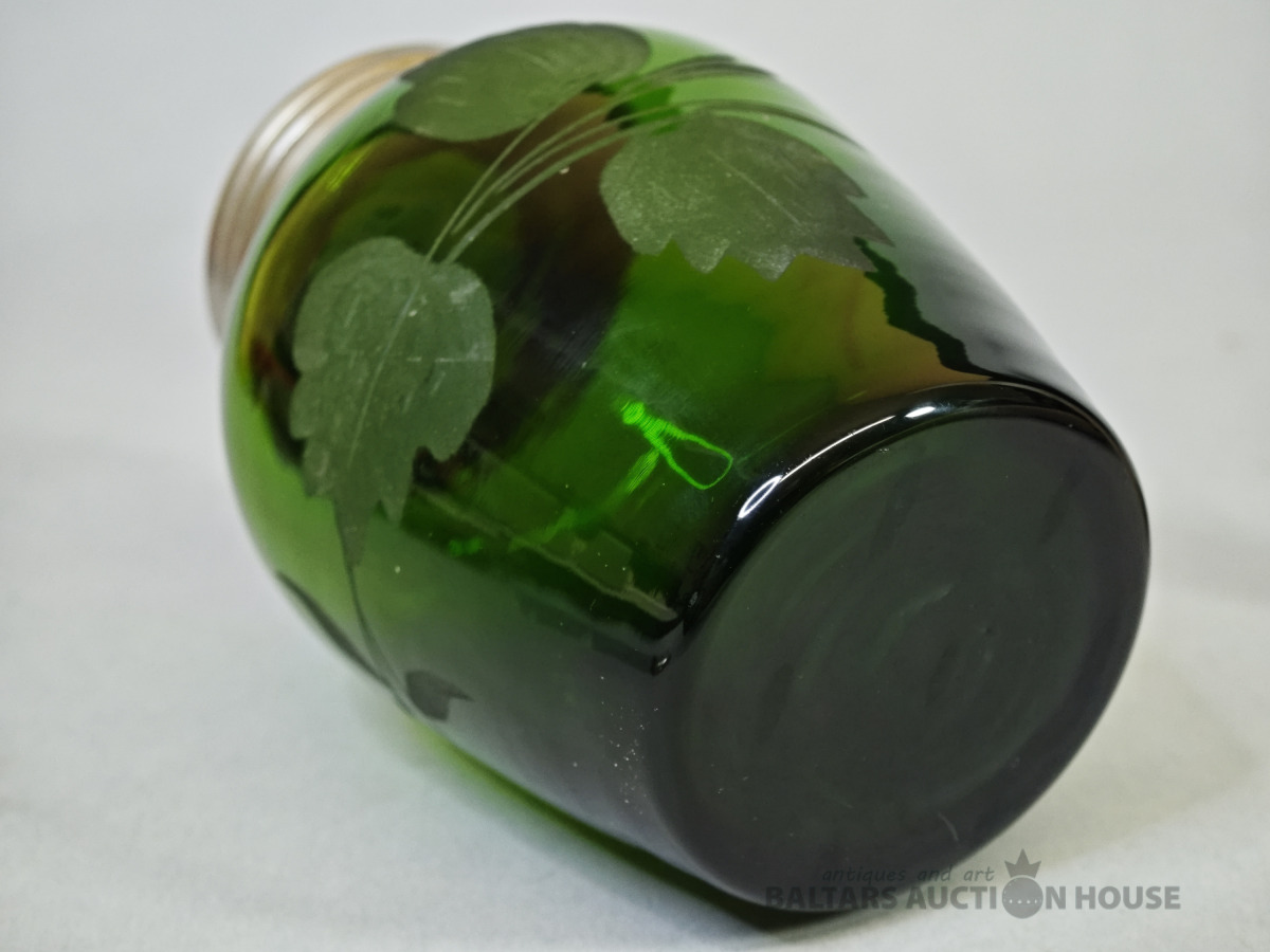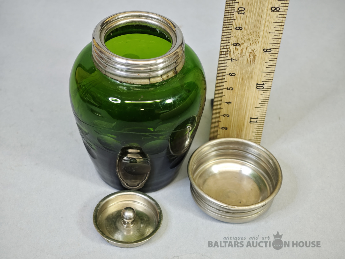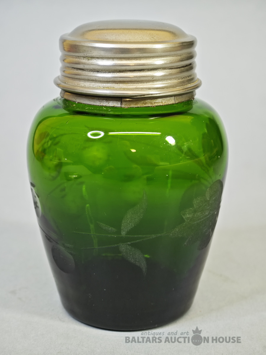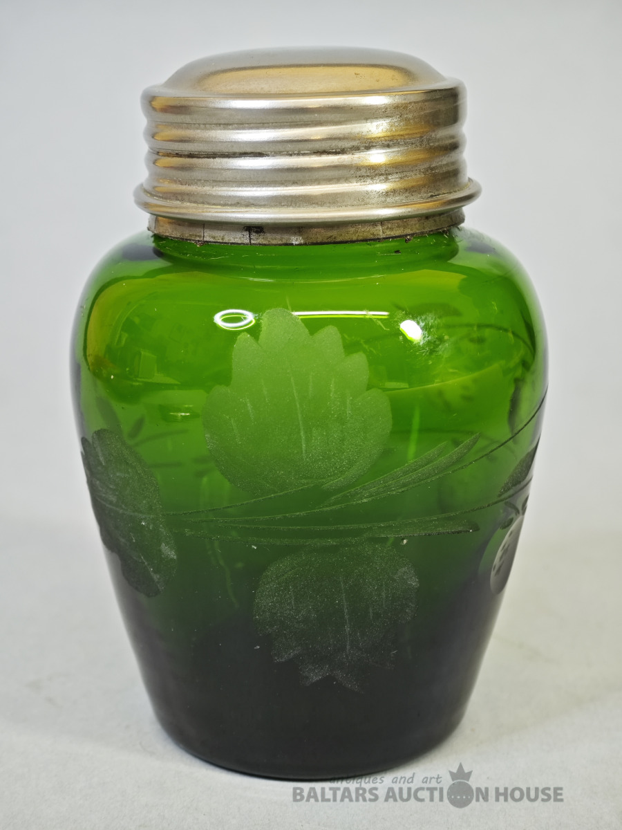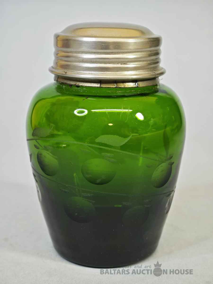 Zaļā stikla tējas kārba ar metāla vāciņu, 20. gadsimta sākums