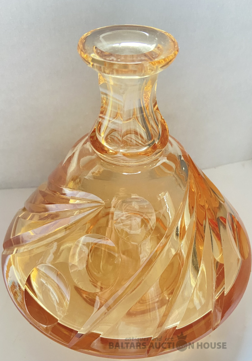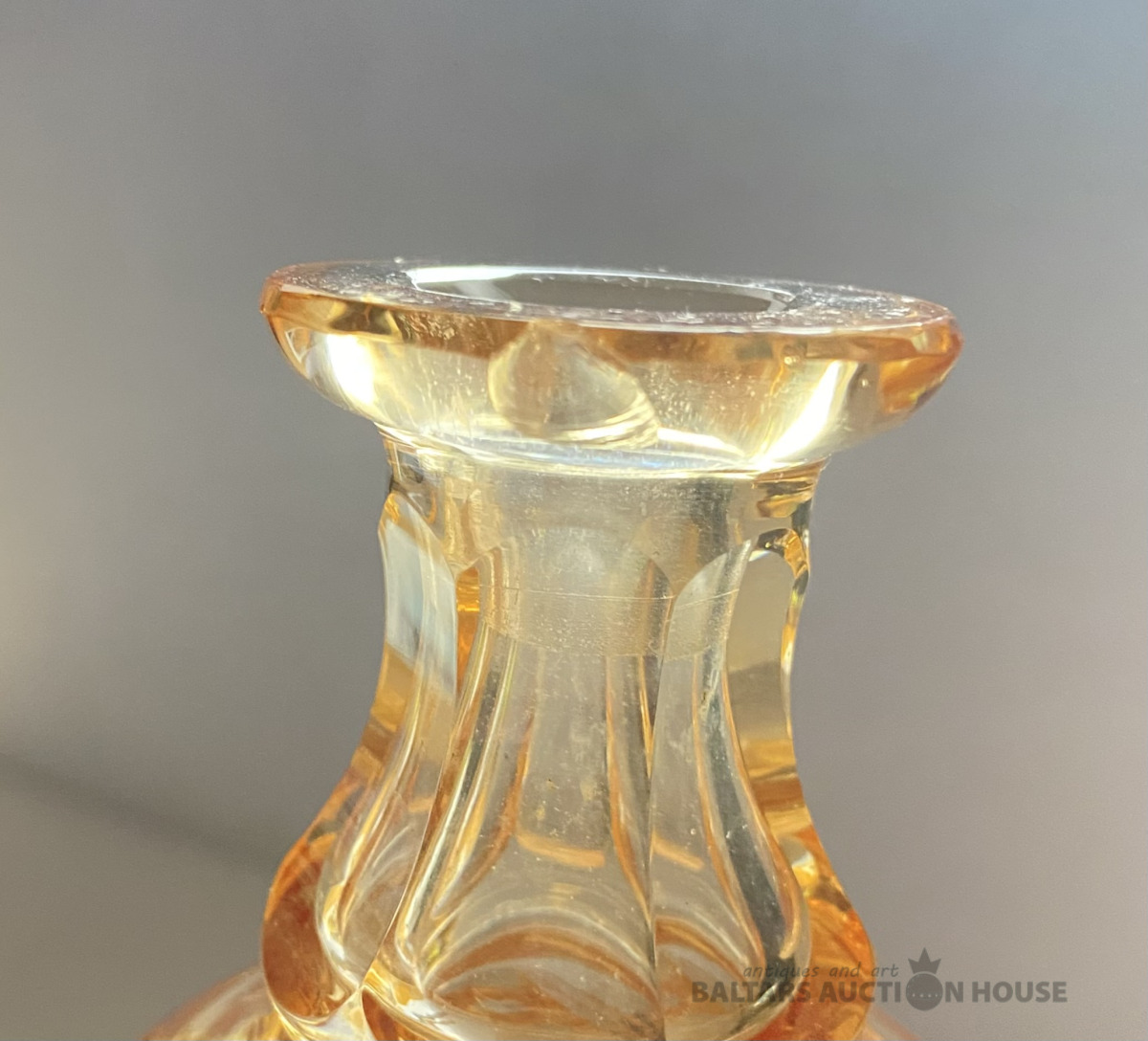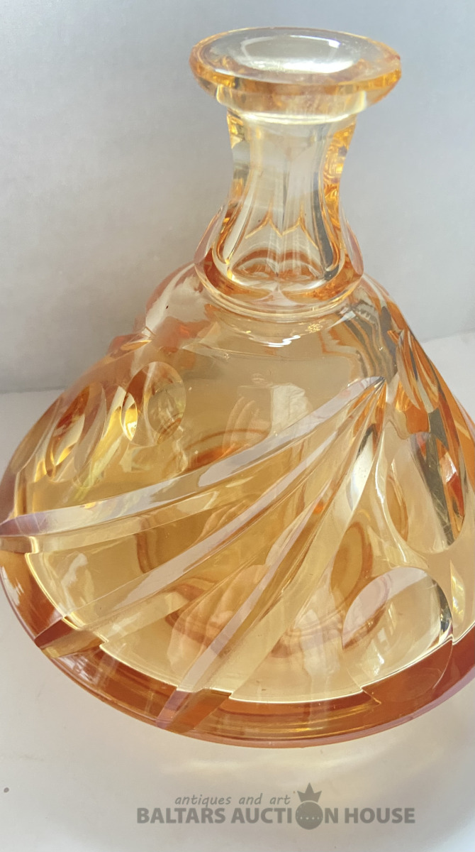 Krāsaina stikla karafe bez vāka, Iļģuciema stikla fabrika? Uz kakla ir robiņš,sk.foto 5-6; H=14,5 cm.