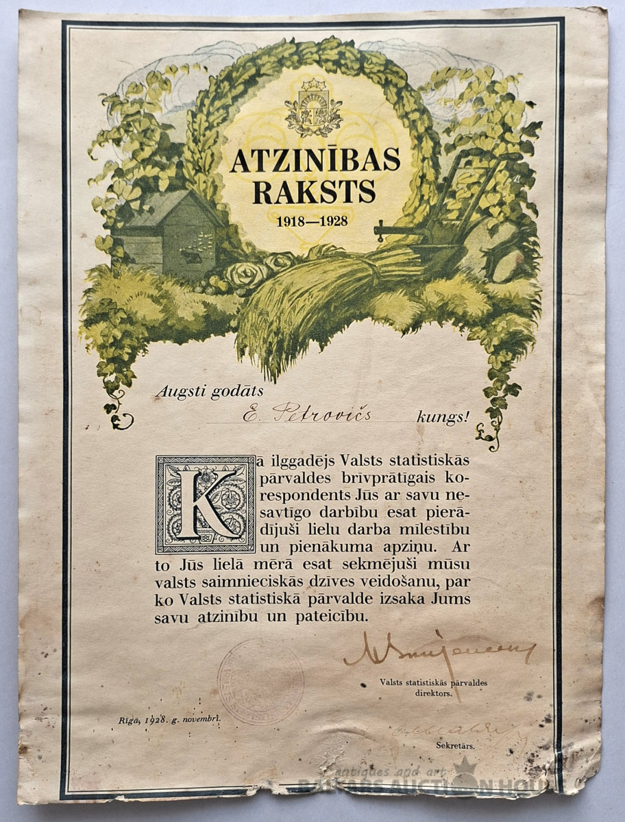 Atzinības raksts (Goda raksts), izdots Latvijā 1928. gadā. Dokumenta veids: Atzinības raksts (goda raksts). Izsniegts: E. Petroviča kungam. Par centīgu darbu kā brīvprātīgajam korespondentam Valsts statistikas pārvaldē. Datums un paraksts: Rīga, 1928. gada novembris, parakstījis Pārvaldes direktors. Raksts ir sliktā stāvoklī.