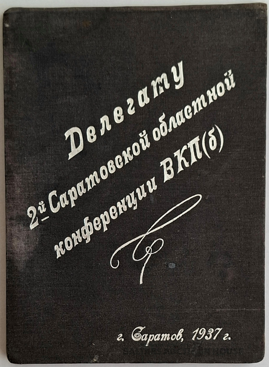 Piezīmju grāmatiņa, kas izdota delegātam uz Vissavienības Komunistiskās partijas (boļševiku) Otro Saratovas reģionālo konferenci. Vissavienības Komunistiskās partijas (boļševiku) Otro Saratovas reģionālo konferenci. Saratova, 1937. gads. 1937. gads bija "Lielā terora" un plaša mēroga tīrīšanu periods PSRS partijas aparātā. Šajā laikā Saratovas apgabalā notika arī nopietnas politiskas pārmaiņas un represijas pret tā vadību. Šādi izdevumi tika izsniegti katram delegātam kopā ar viņa mandātu, un tajos bija ietverta darba kārtība, komiteju saraksti vai vieta piezīmēm sanāksmju laikā. Šādi priekšmeti ir vērtīgi artefakti vietējiem vēsturniekiem un padomju vēstures speciālistiem.