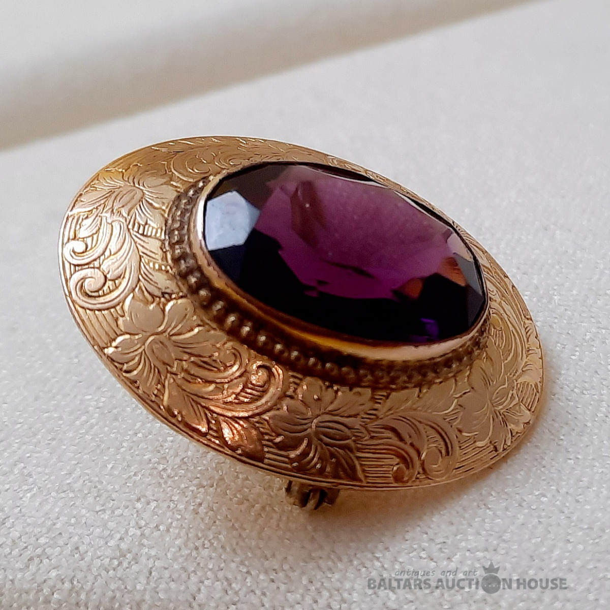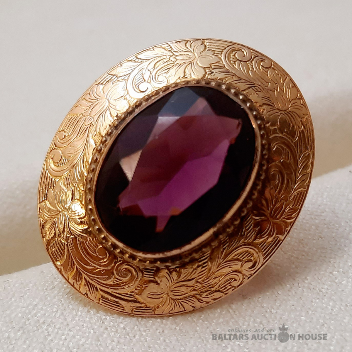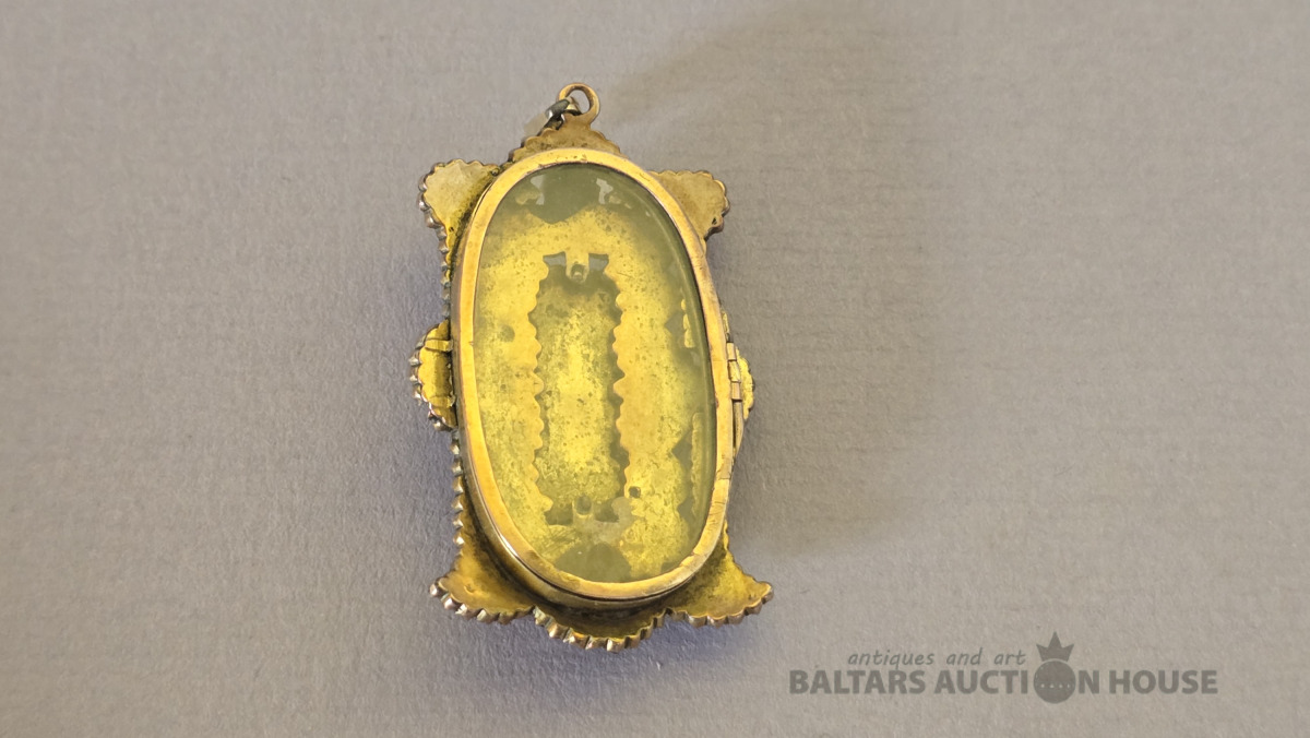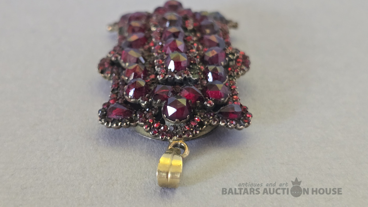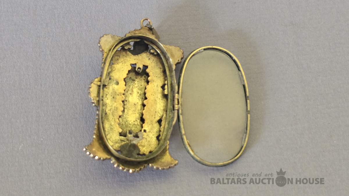 Autordarbs. Iespaidīgs, bagātīgi dekorēts kulons, kas inkrustēts lielākiem un mazākiem granātiem, kuri blīvi aizpilda kulona virsmu. Tas aizmugurē atveras kā glabātuve. Rets un labi saglabājies 19. gadsimta beigu rotaslietu paraugs.
