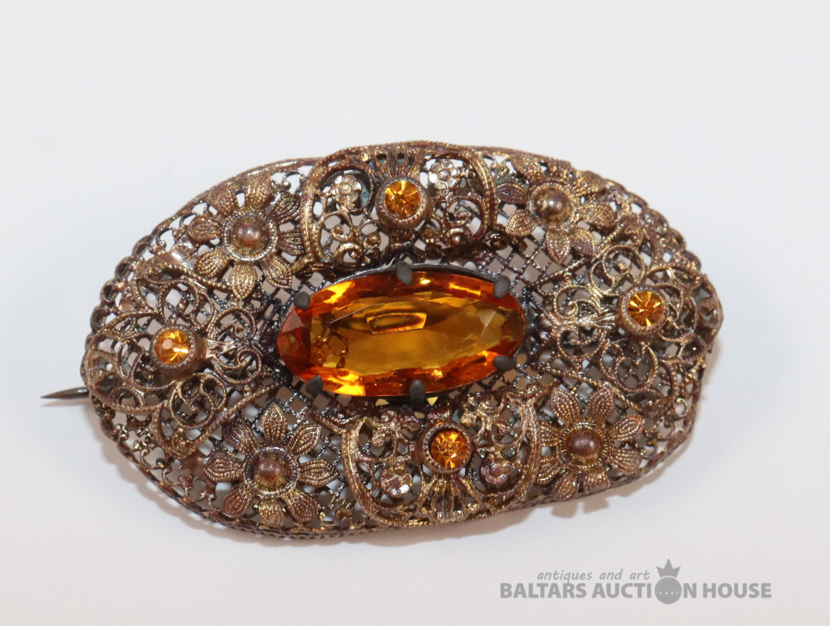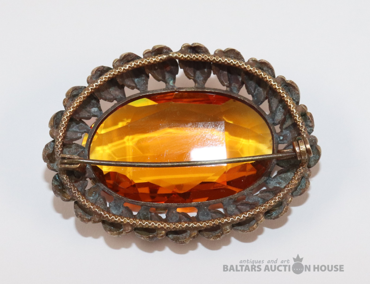 Brošas 2 gab. un kaklarota. Brošas 3,8x5,3 cm, 3,2x5,4 cm. Kaklarotas ķēdes garums 63 cm, piekariņš 5x4,7 cm