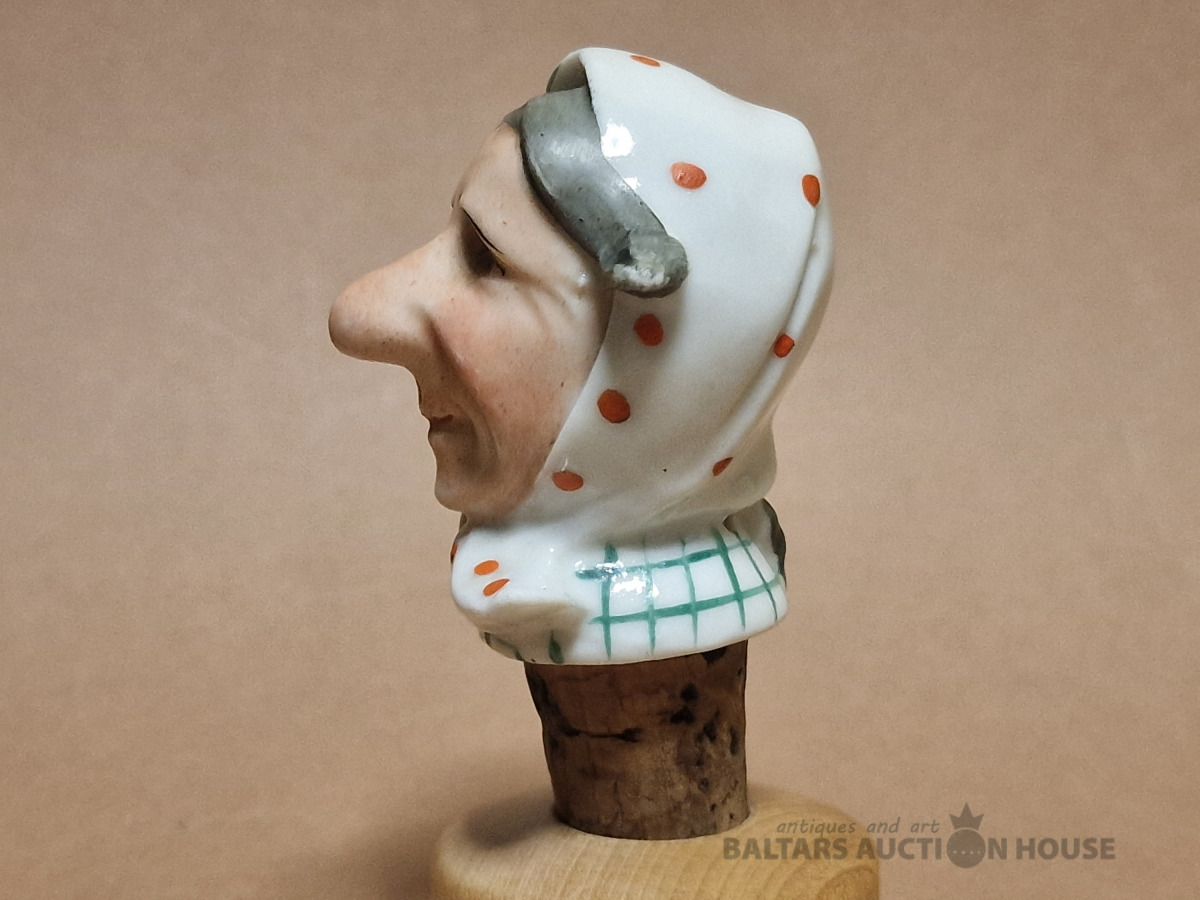 Pudeļu korķis. Omīte pumpainà lakatiņà. Vācija 30tie 40tie gadi. Porcelāns/korķis h 8,5 cm.