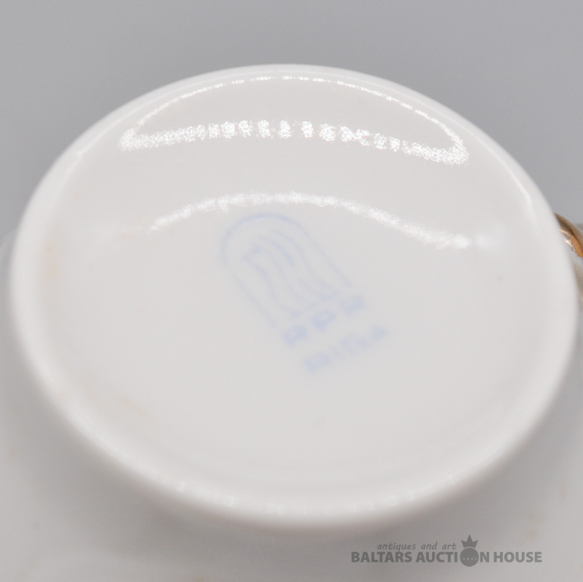 Rīga. Servīzes "Marianna" daļas. 9 priekšmeti. Vienai krūzei un šķīvim ir noškēlums.