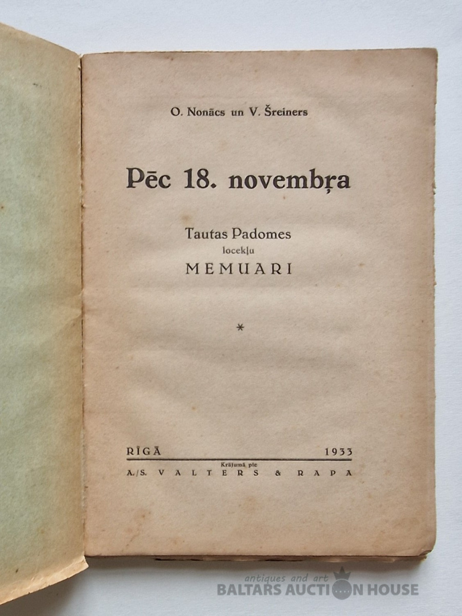 Nr.1512. Pēc 18. novembra. Tautas Padomes locekļu memuāri. O. Nonācs; V. Šreiners. AS Valters un Rapa, 1933. gads