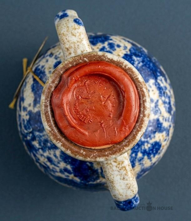 Dizains: Keramikas amfora ar diviem rokturiem, dekorēta ar zili-baltu "splash" glazūru. Saglabājusies oriģinālā zelta etiķete/birka.