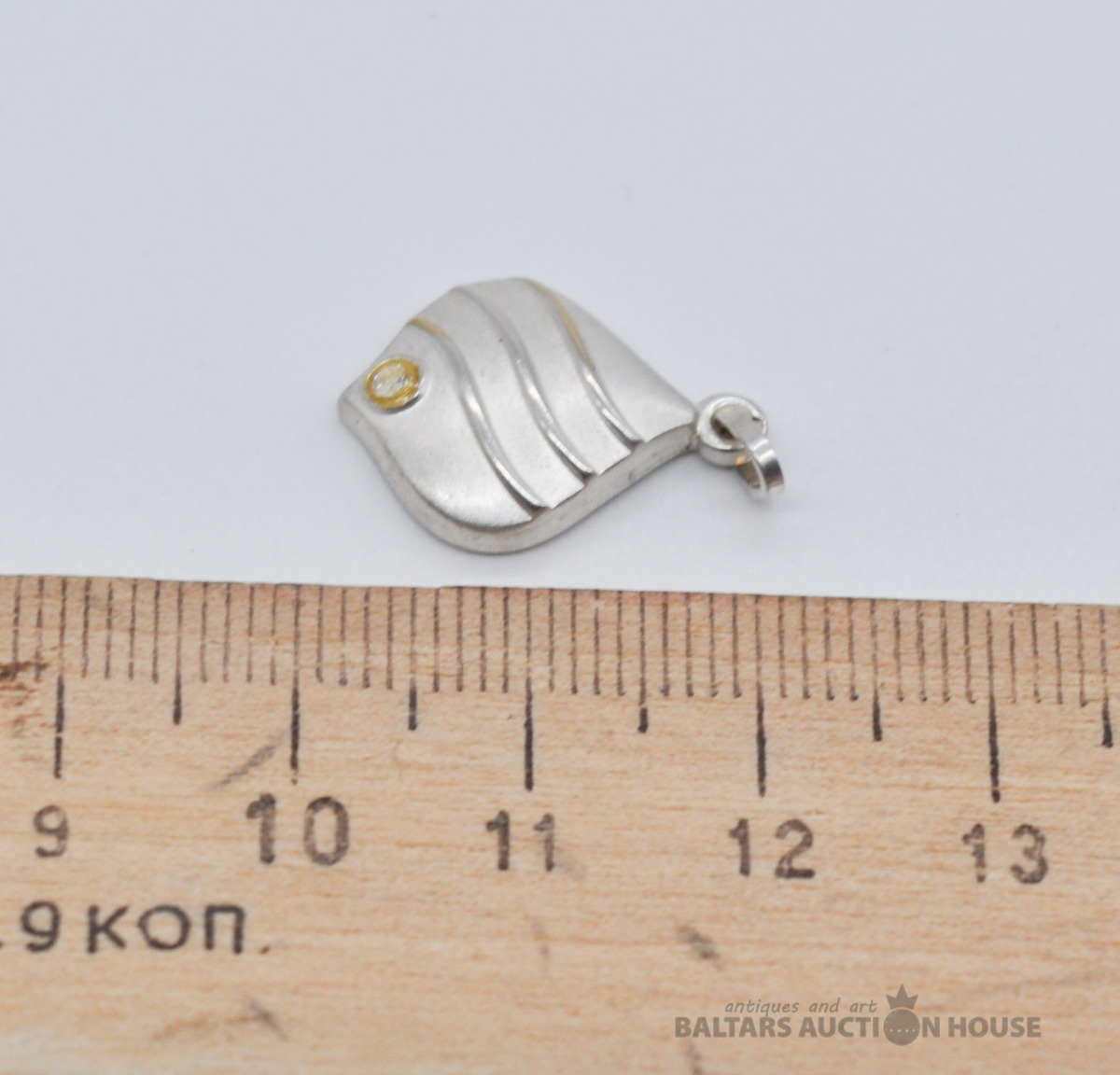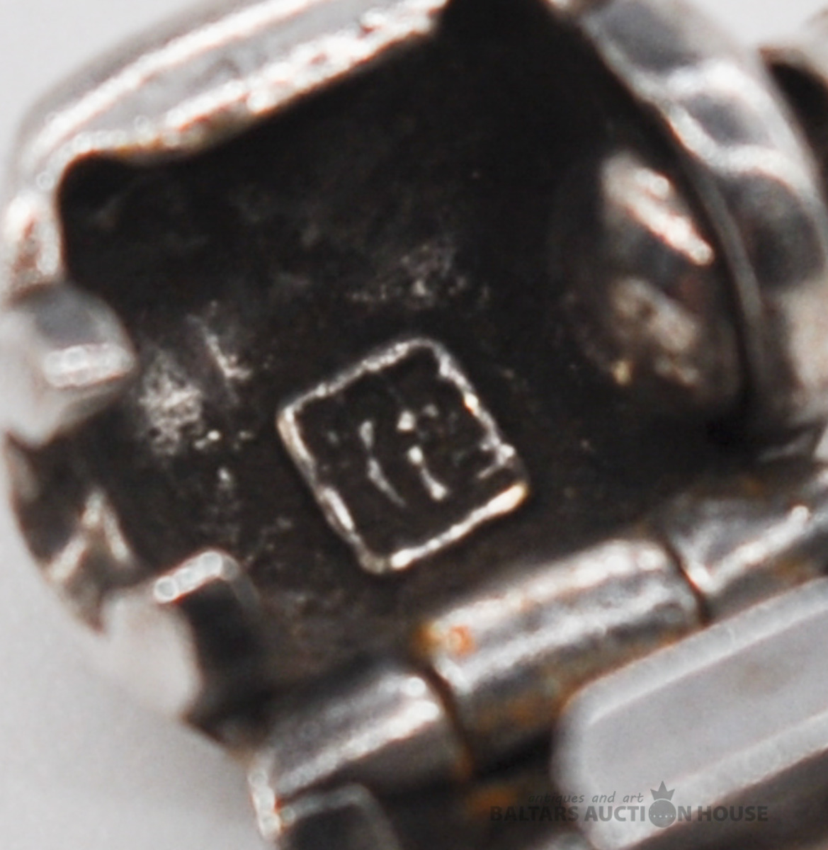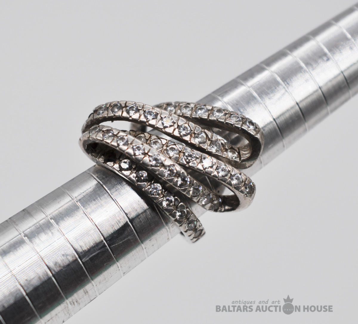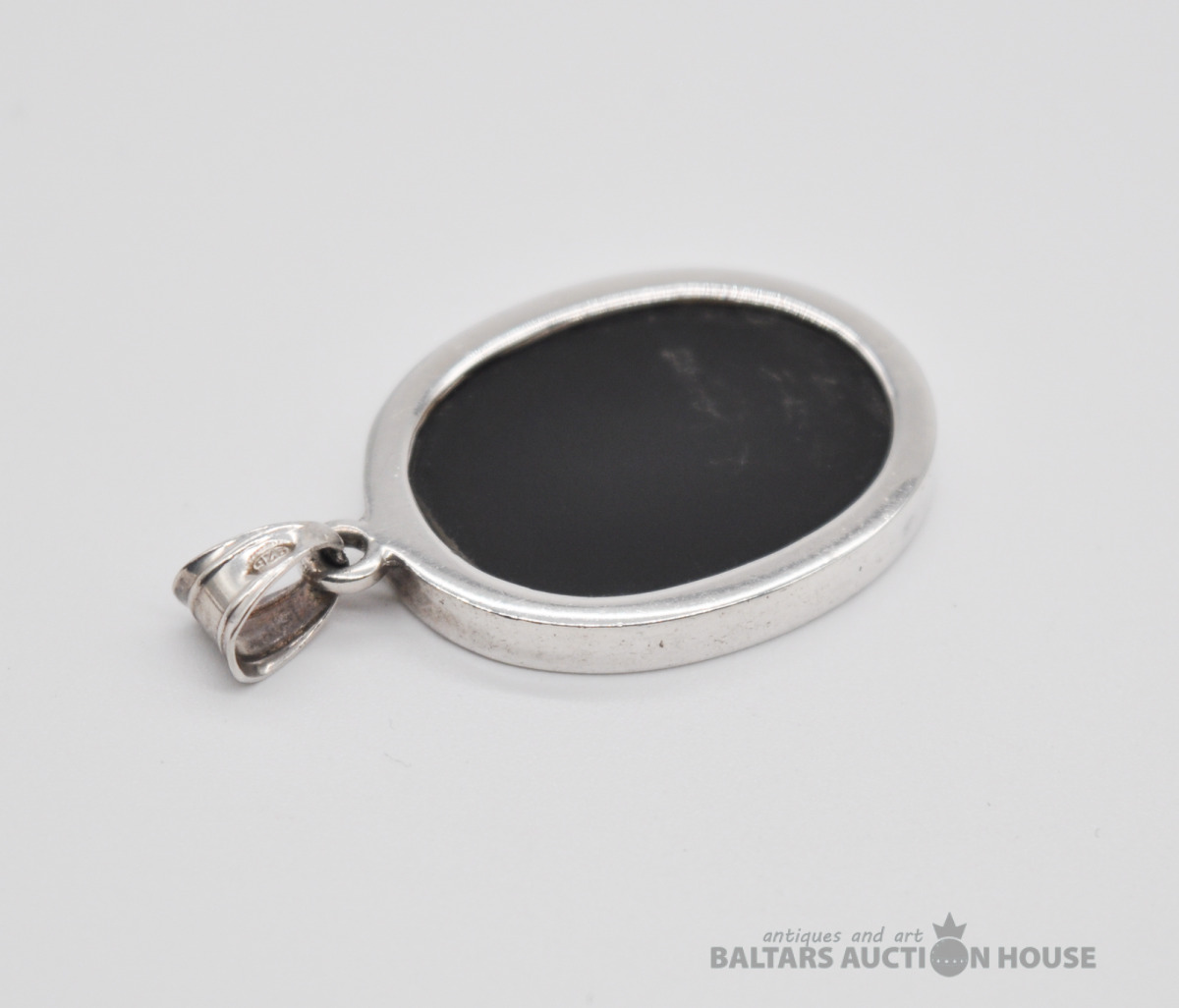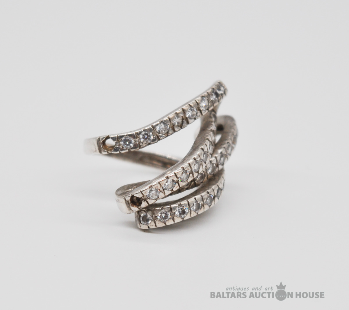 Art Deco stila piespraude ar baltiem akmeņiem. Sudrabs, 925. prove. Svars 5,55 grami. Augstums 7 cm.