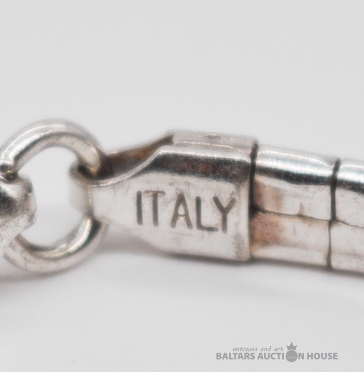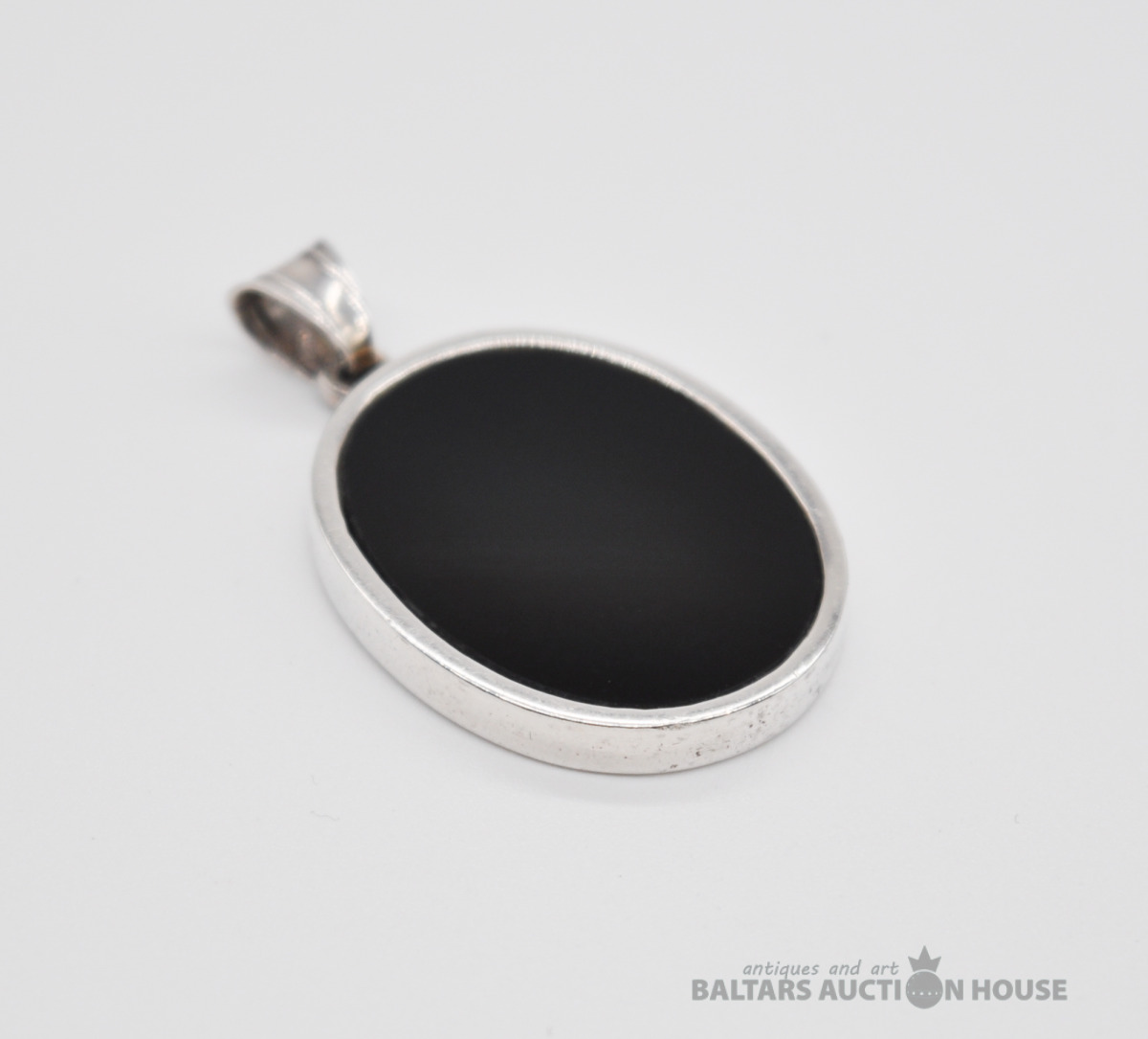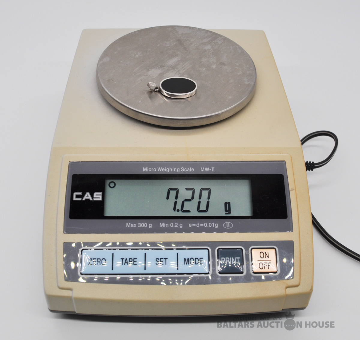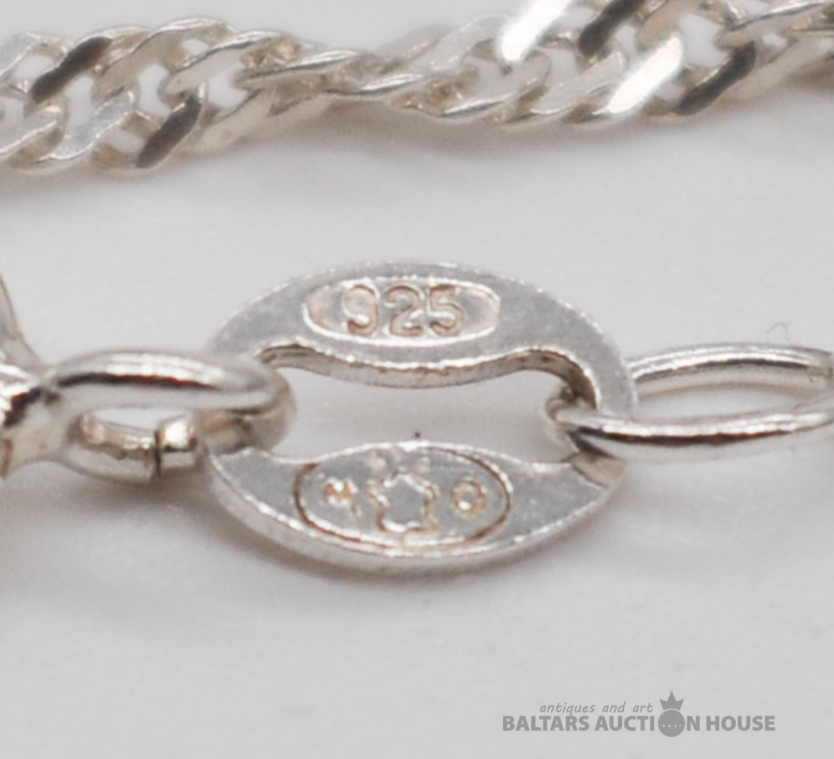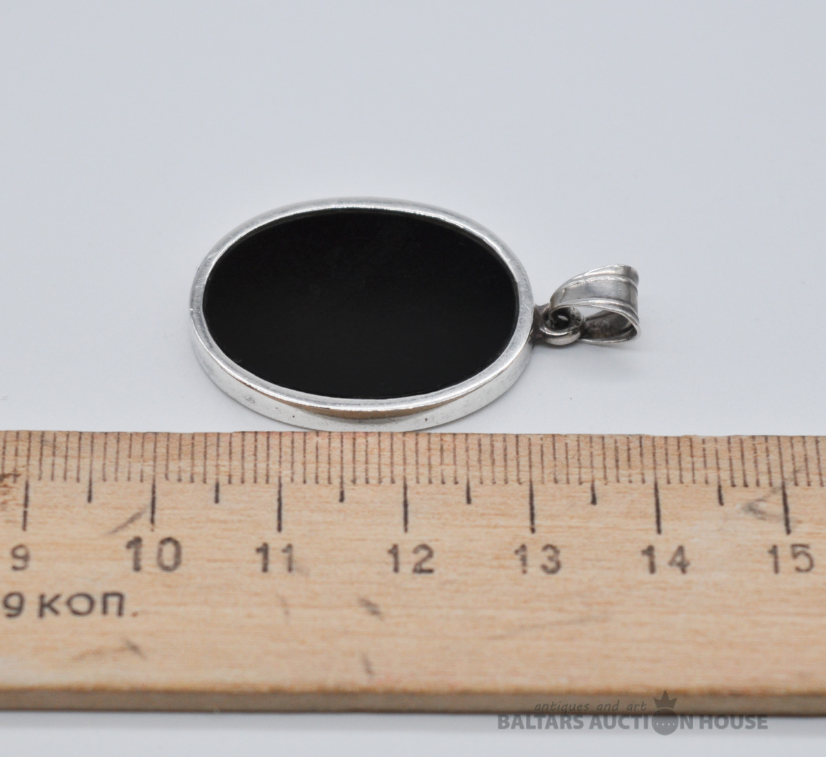 Art Deco stila piespraude ar baltiem akmeņiem. Sudrabs, 925. prove. Svars 5,55 grami. Augstums 7 cm.