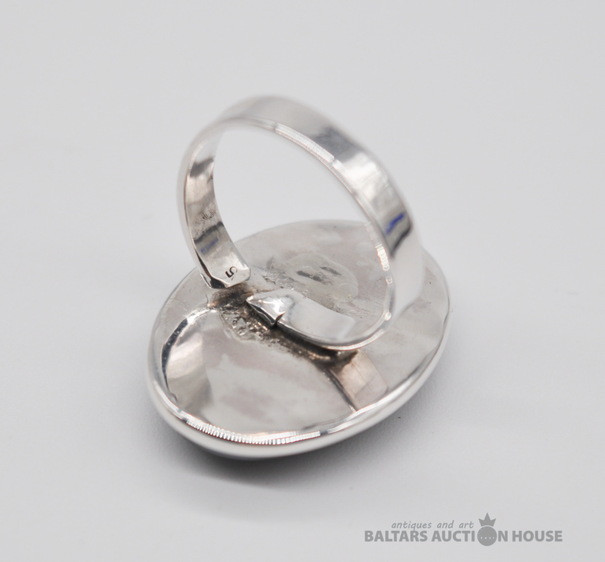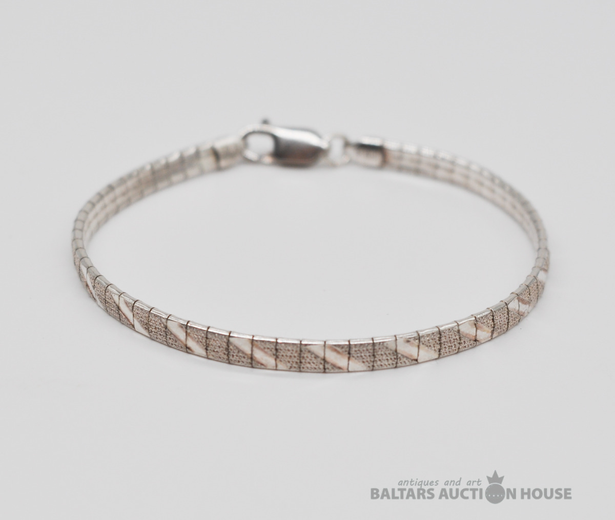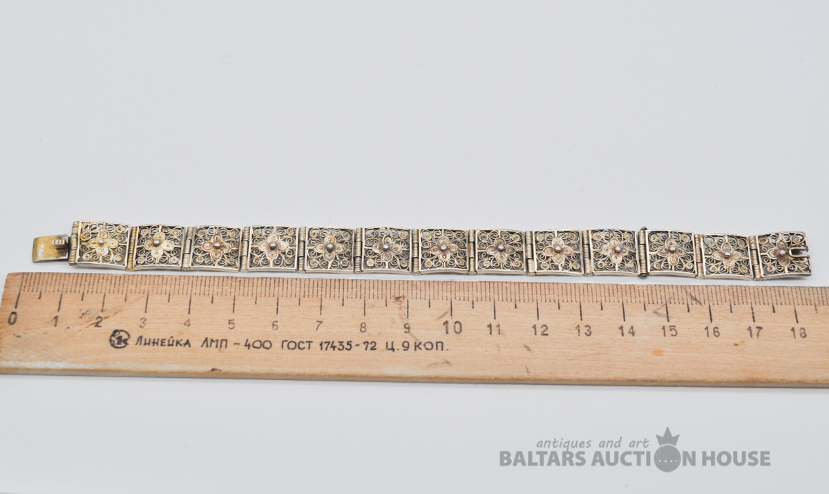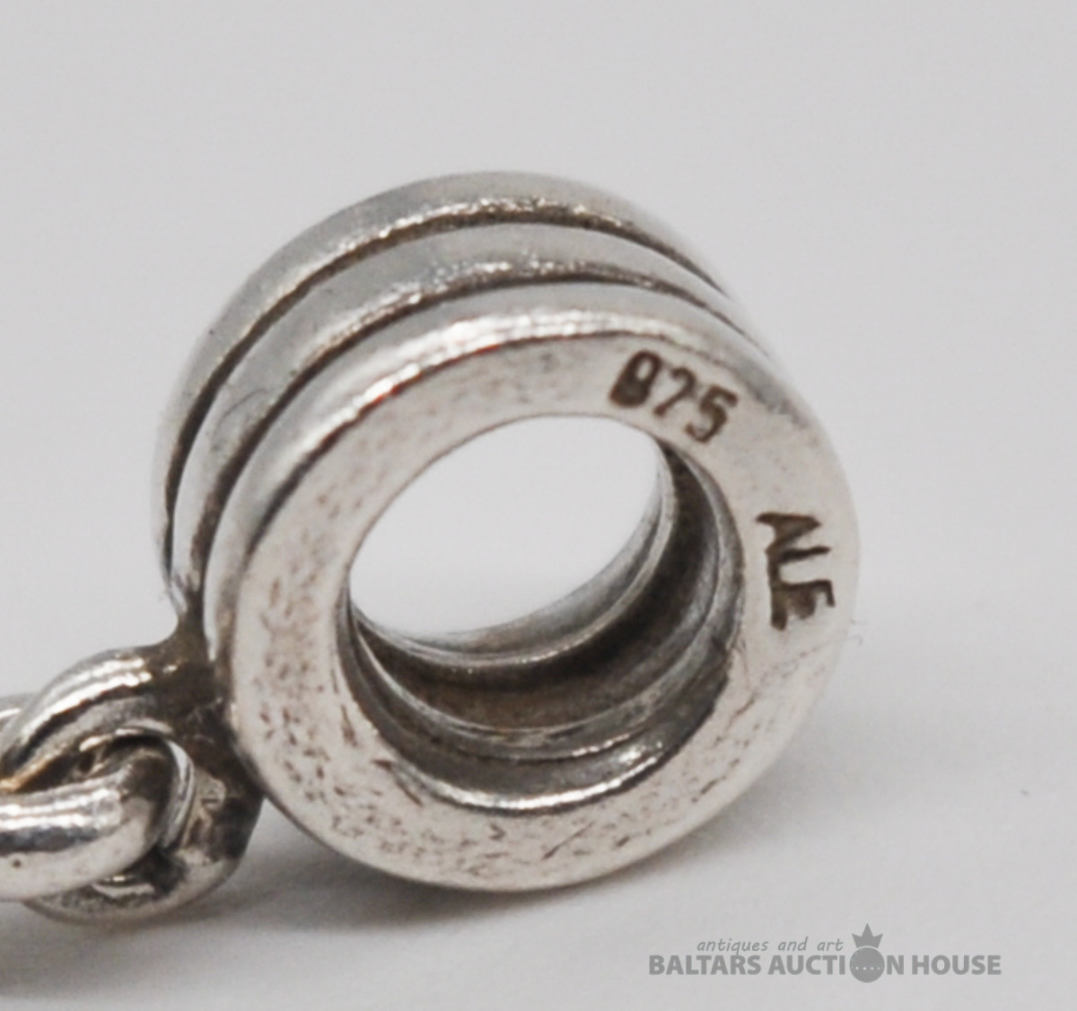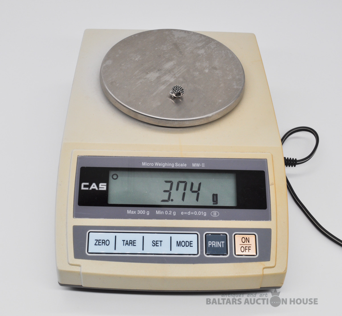 Art Deco stila piespraude ar baltiem akmeņiem. Sudrabs, 925. prove. Svars 5,55 grami. Augstums 7 cm.