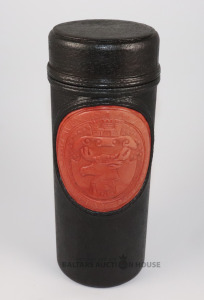 Trauks ar vāku JELGAVA. Autors Ēriks Priedkalns, āda, roku darbs. h=29,5 cm. d=11 cm