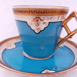 Kuzņecovs? mokas izmēra kafijas pāris,bez zīmoga,tase 6,5 cm h, 6,7 cm d., Tasei pamatnē daži skrāpējumi, osai zelta zudums, tumšs pleķis