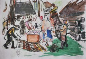 Dzidra Bauma. Akvarelis. "Gadatirgus Brīvdabas Muzejā". 28x40 cm.