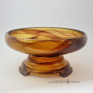 Skaista Art Deco stila bļoda, ko 20. gs. trīsdesmitajos gados izgatavojis britu ražotājs Davidson. Šāda veida virpuļotais stikls ir pazīstams kā mākoņstikls, un katrs izstrādājums ir unikāls. Skaista dzintara krāsa., Piegādes komplektā ietilpst oriģinālais cokols pieskaņotā duļķainā stiklā bez šķembām vai plaisām. Augstums ar pamatni - 12,5 cm. Diametrs - 23,5 cm.