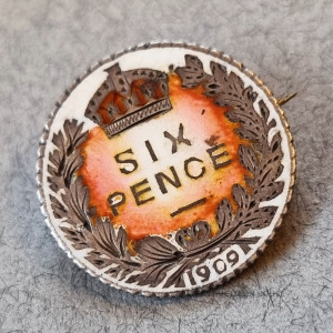 BROKŠA - Sixpence, Apvienotās Karalistes karalis Edvards VII, 1909. Sudrabs. Diametrs 19 mm. Emalja.