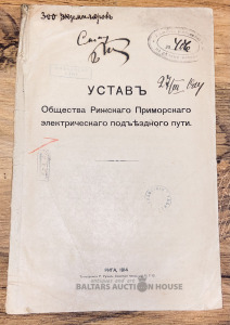 Уставъ общества Рижского Приморского электрического подъездного пути,1914 год, 36 страниц.