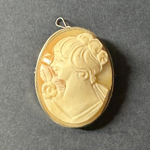 Antīka Kameja sudraba ietvarā, lielums 37x29 mm, dabīgs gliemežvāks, sudrabs 800, pārbaudīts apzīmogots Proves birojā, piespraude, papildus cilpa, lai valkātu kā kulonu, piespraudes atslēga ar aizgriežamu drošības slēdzēju. Bez defektiem.