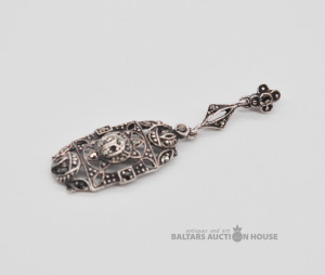 Sudraba piekariņš ar markazītiem. Trūkst viens akmentiņš. Garums 45 mm. Svars 3.3 grami.