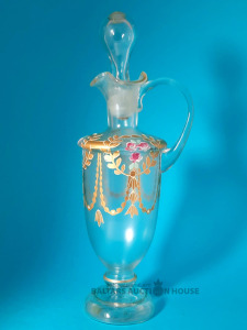 ***Manufaktura FRITZ (Frīdrihs Vilhelms) HECKERT***Krūkas formas dekantere ar korķi. Caurspīdīgs, krāsots stikls, augstums 25 cm. Silēzija, Petersdorfa (tagad Pehovice), ap 1880. gadu. Apaļš, piepūšams kāts; tievs, olveida korpuss ar ziedu rakstu. Caurspīdīgs, C veida rokturis. Īss kakliņš. Piepūšams korķis ar smailu galu.