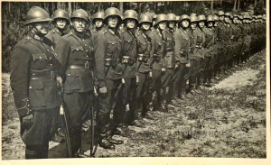 Fotogrāfija ar karavīru grupu ķiverēs, Latvijas armija. 1930.–40. gadi.