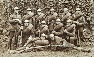 Fotogrāfija ar karavīru grupu ķiverēs, Latvijas armija. 1930.–40. gadi.