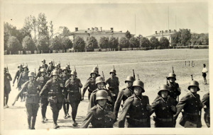 Fotogrāfija ar karavīru grupu ķiverēs, Latvijas armija. 1930.–40. gadi.