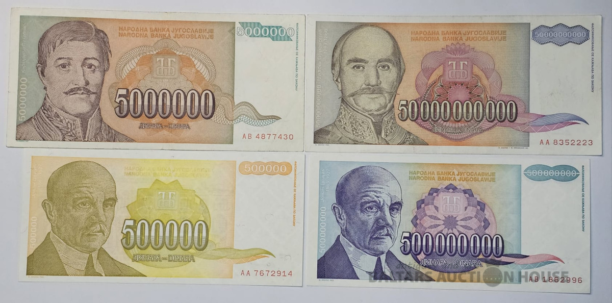 Banknotes, Jugoslavia/Yugoslavia 4 b-notes: 500 000 - 50 000 000 000 Dinari 1993, UNC