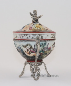 Porcelāna trauks sudraba ietvarā. Roku gleznojums, sudrabs 800. Svars 59,96 g. Vākam iekšpusē neliels nošķēlums. h=13,3 cm