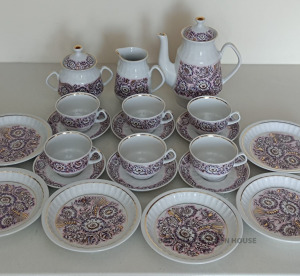 Servīze 6 personām MĀRA. Porcelāns, zeltījums, dekols. RPR. Zilie un sarkanie zīmogi.