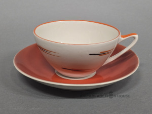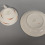 Tējas komplekts , Rīgas porcelāna un fajansa fabrikas tējas komplekts no servīzes "Sakta" Modeļa autore Zina Ulste, 20. gs. 60. gadi. Porcelāns, roku darbs.. krūze - 5,5x10 cm, apakštase 14,5 cm