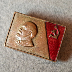 Padomju Savienības nozīmīte ar Vladimira Ļeņina attēlu un karogu ar sirpi un āmuru.