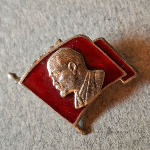 Padomju atloka nozīmīte ar Vladimira Iļjiča Ļeņina profilu uz sarkana karoga fona.
