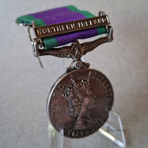 1962. gada Vispārējā dienesta medaļa ar Ziemeļīrijas stieni. Šī medaļa tika ieviesta 1964. gadā, lai aizstātu iepriekšējās versijas, un tika piešķirta par dienestu kampaņās un operācijās, kas netika uzskatītas par pilna mēroga kariem. ZIEMEĻĪRIJA ELIZABETE II, AR DIEVA ŽĒLASTĪBU,