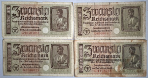 4 x 20 reihsmarkas, ko izdeva Reihskreditkassenschein (Reiha kredītbankas) izmantošanai okupētajās teritorijās Otrā pasaules kara laikā (1940–1945).